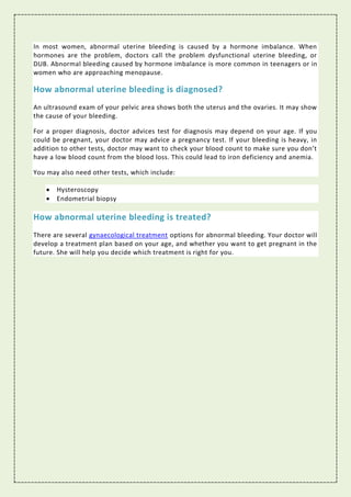Abnormal uterine bleeding (AUB) refers to irregular bleeding between menstrual periods, prolonged periods, or very heavy menstrual flow, often due to hormonal changes, fibroids, or other structural causes. Diagnosis typically involves ultrasound and may require additional tests like hysteroscopy or biopsy, while treatment options are tailored to individual circumstances, including age and fertility desires. Common symptoms include soaking through tampons or pads every hour and bleeding lasting over seven days.