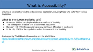 The document emphasizes the importance of accessibility for applications, highlighting that over 1 billion people globally have disabilities that affect their interaction with technology. It outlines various types of disabilities, accessibility guidelines, testing strategies, and tools to ensure universal access and compliance with standards like WCAG 2.0. The concluding message stresses the need for accessibility awareness, implementation, and user-focused engineering plans to improve end-user experiences.