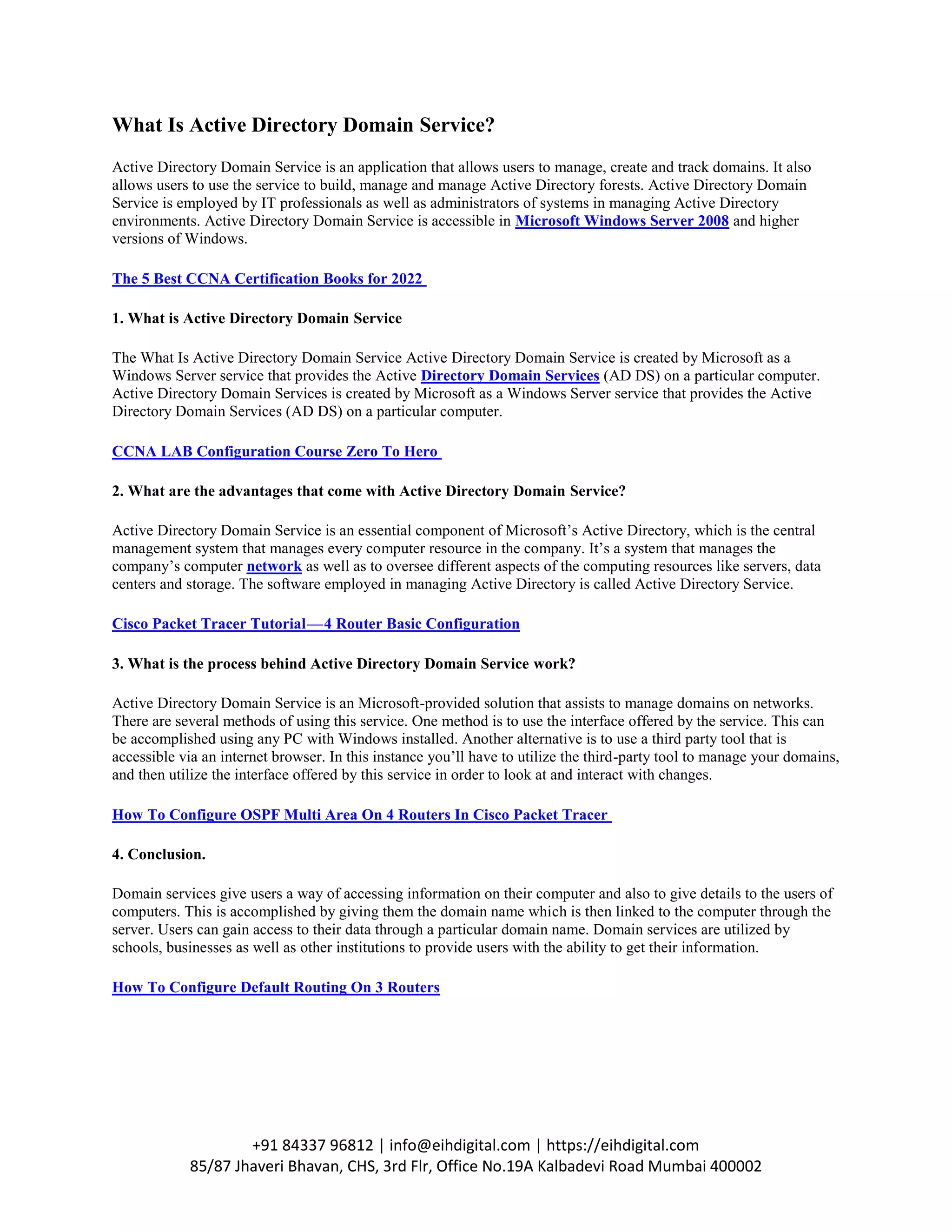 Active Directory Domain Service is a Windows Server service that provides Active Directory Domain Services (AD DS) on a computer. It allows users to manage, create and track domains as well as build, manage and administer Active Directory forests. Some advantages of Active Directory Domain Service include central management of computer resources like servers, data centers and storage. It works by using an interface or third-party tools to manage domains, with changes viewed and interacted with via the service's interface.