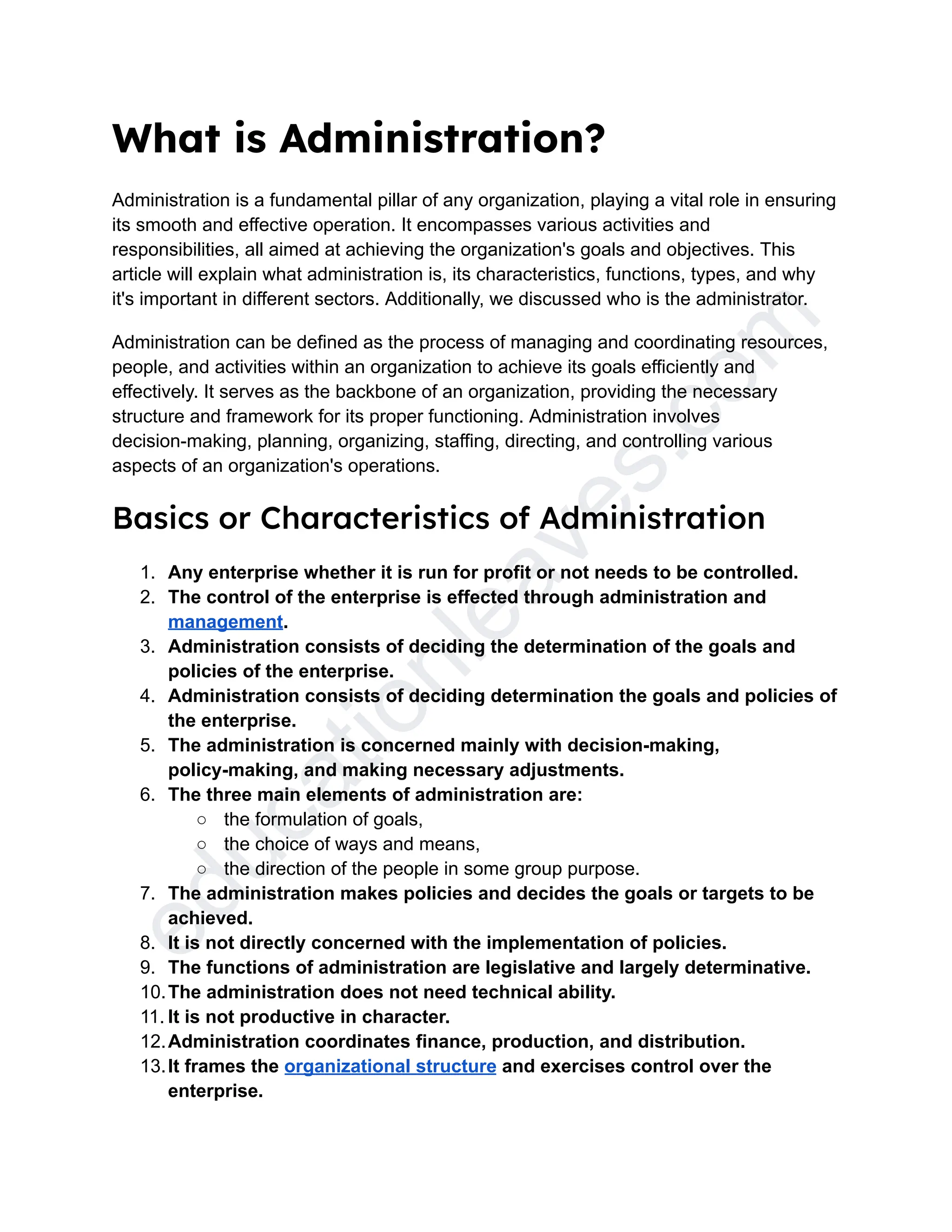 Administration is the process of managing and coordinating resources, people, and activities within an organization to achieve its goals efficiently and effectively. It involves decision-making, planning, organizing, staffing, directing, and controlling various aspects of an organization's operations. There are three main types of administration: centralized administration where decision-making authority is concentrated at the top; individual administration where each department is self-managed; and semi-centralized administration which balances central control with decentralized decision-making. Effective administration provides structure, goal achievement, coordinated decision-making, compliance, and adaptability to help organizations function properly and thrive.