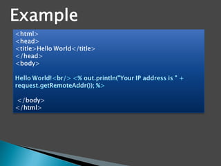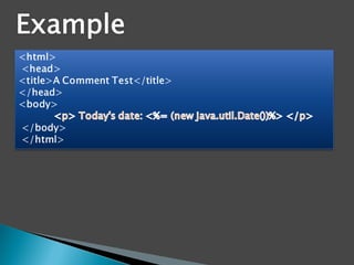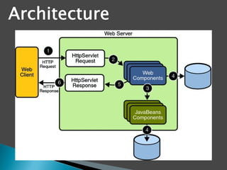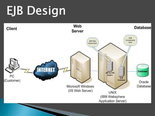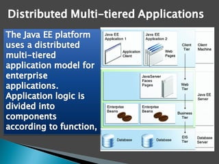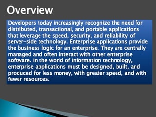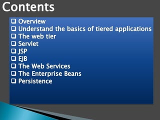 The document provides an overview of Java EE technologies, including servlets, JavaServer Pages (JSP), and Enterprise JavaBeans (EJB). It explains the functionalities of servlets in generating web content, the usage of JSP for building dynamic web pages, and the architecture of EJB for developing scalable business applications. Key concepts such as session beans, entity beans, and message-driven beans are discussed, highlighting their roles in client interaction and data persistence.