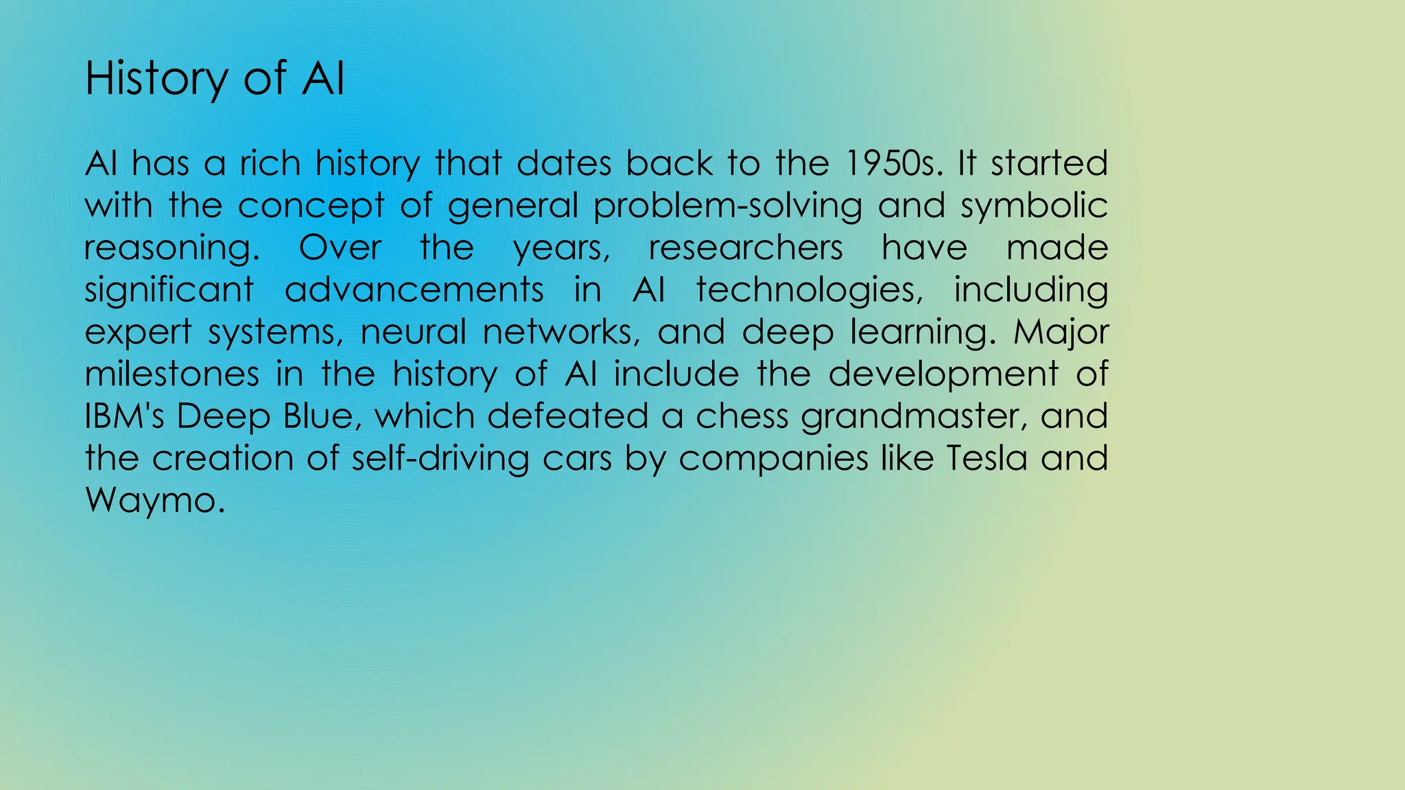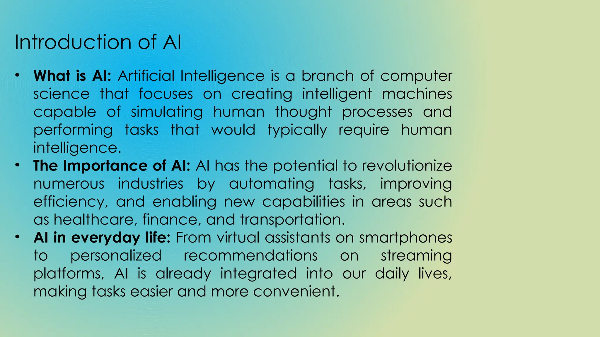 The document provides an overview of artificial intelligence (AI), its significance, history, types, applications, and challenges, emphasizing its transformative potential across industries like healthcare and finance. AI can be categorized into narrow AI, general AI, and superintelligence, with various ethical concerns arising from its deployment, such as job displacement and safety. The future of AI promises advancements in automation, personalized services, and education, highlighting the importance of ethical considerations alongside continued innovation.