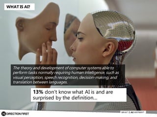 The document discusses artificial intelligence (AI) and what it is. It provides the definition of AI as the theory and development of computer systems able to perform tasks normally requiring human intelligence, such as visual perception, speech recognition, decision-making, and translation between languages. It also notes that 13% of people don't know what AI is and are surprised by the definition, while 85% are comfortable buying products and services online and only 30% are comfortable using self-driving cars.