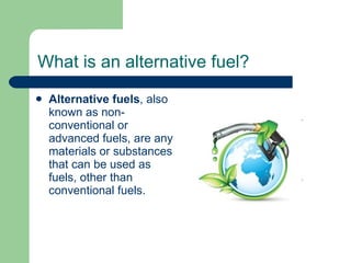 The document discusses several alternative fuels including biodiesel, hydrogen, methanol, ethanol, electricity, liquified petroleum gas, and biomass. Biodiesel is produced from vegetable oils and animal fats and can be blended with petroleum diesel. Hydrogen is the most abundant element and its environmental impact depends on how it is produced. Methanol is produced from natural gas and ethanol is produced by fermenting biomass. Electricity is readily available but electric vehicles are currently expensive. Liquified petroleum gas is a byproduct of petroleum refining and biomass is plant matter used to generate electricity or heat but produces air pollution.