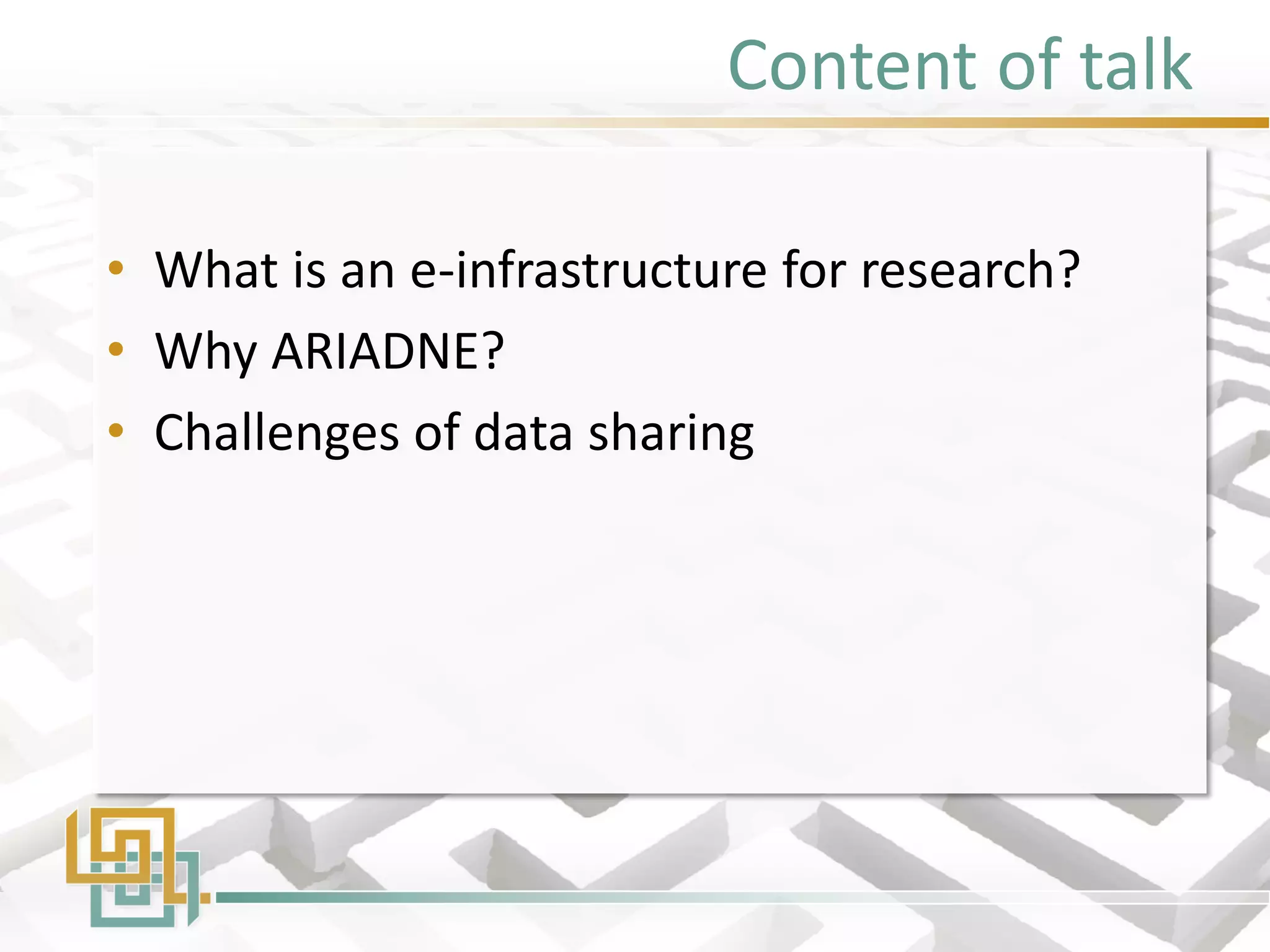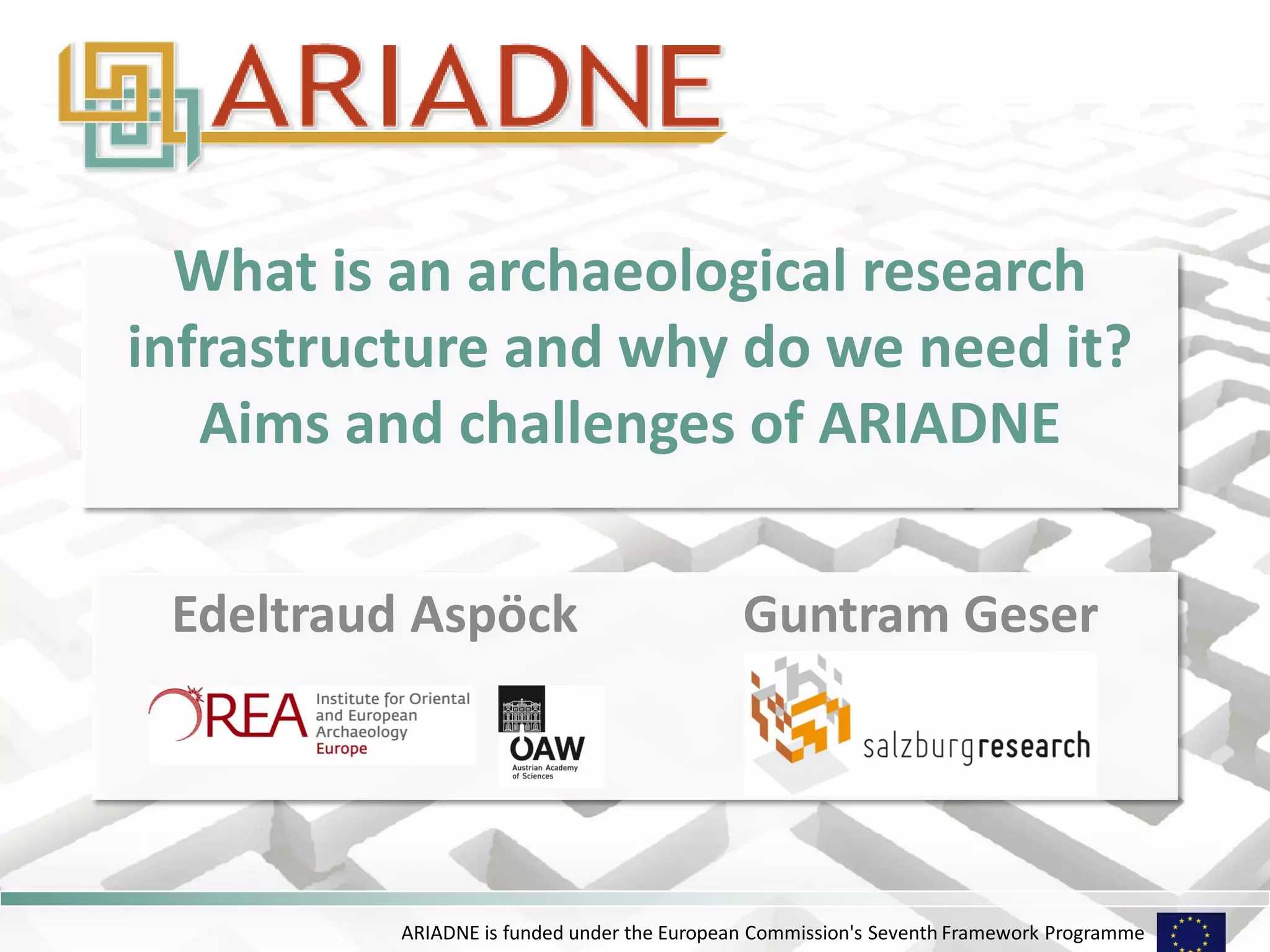 Ariadne is a European Commission-funded project aiming to improve access to archaeological data through a collaborative e-infrastructure, which facilitates data sharing and integration across various disciplines. With a budget of €6.5 million, the project launched in February 2013 and involves 24 partners from 18 European countries. It addresses challenges in data management, access, and interoperability, promoting open data practices within the archaeological community.