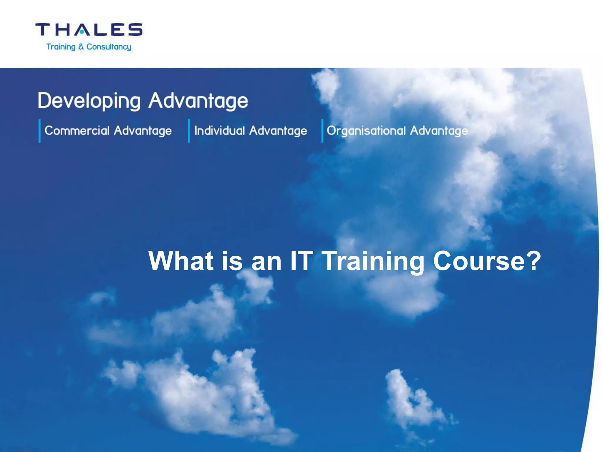 IT training courses are essential for businesses to enhance staff skills and leverage technology for increased productivity and efficiency. These courses cover a range of topics from basic desktop application usage to advanced programming and data management, tailored to meet the specific needs of employees. Choosing a reputable training provider, such as Thales Training and Consultancy, is crucial for ensuring effective training outcomes.