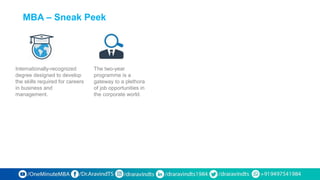 The document provides an overview of an MBA (Master of Business Administration) degree. It discusses that an MBA is a internationally-recognized two-year program that develops business and management skills. It is a gateway to various career opportunities in the corporate world. The document outlines the different types of MBA programs including full-time, part-time, online, and executive MBA. It also discusses popular MBA specializations, eligibility requirements, entrance exams, scope and placement opportunities after an MBA. Key differences between MBA and PGDM are highlighted.