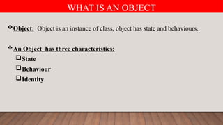 Object: Object isan instance of class, object has state and behaviours.