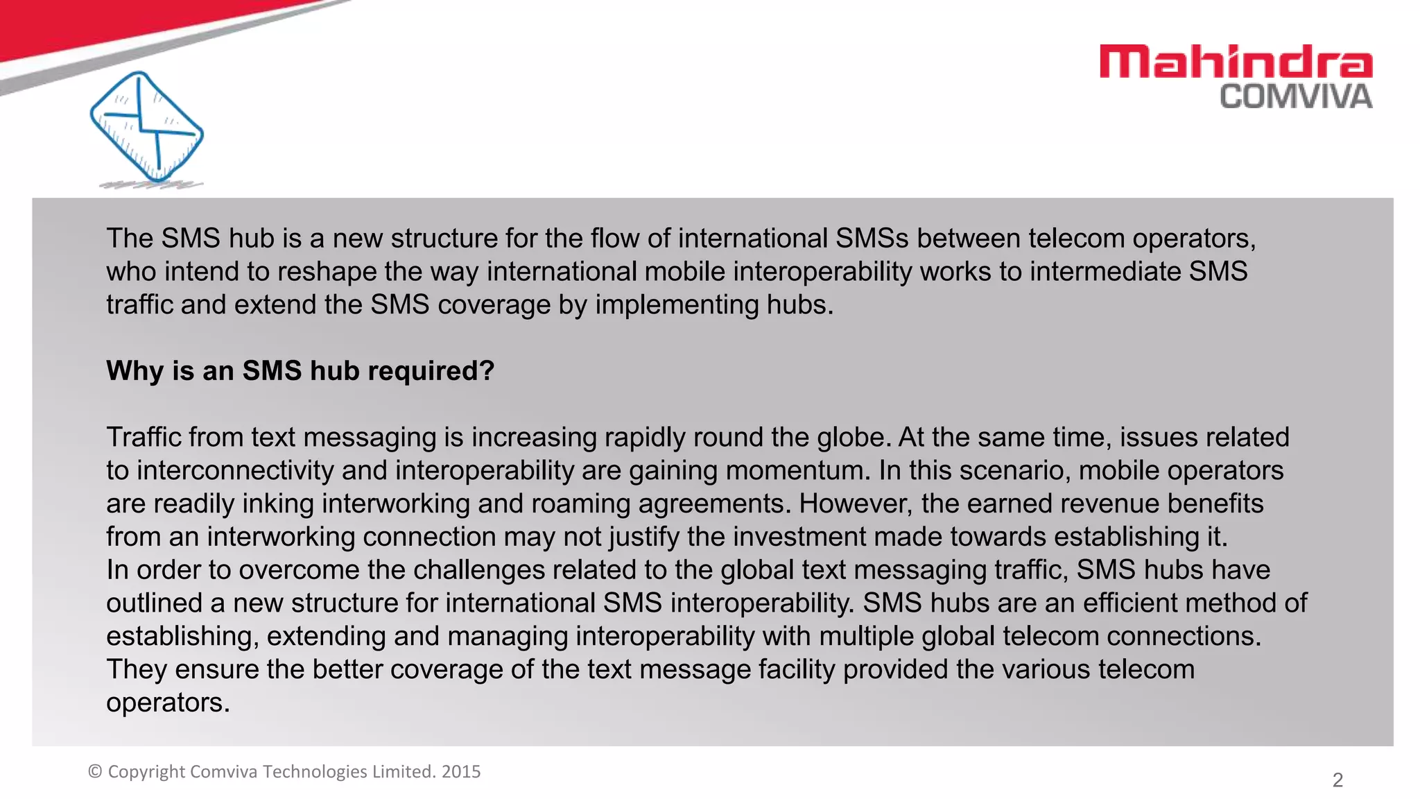 The SMS hub is a new structure aimed at improving international SMS interoperability among telecom operators by managing and extending SMS traffic coverage. It helps resolve challenges related to the rapid increase in global text messaging traffic without the need for complex bilateral roaming agreements, leading to reduced capital expenditures for telecom operators. Additionally, SMS hubs enhance customer service by facilitating seamless global messaging for subscribers.