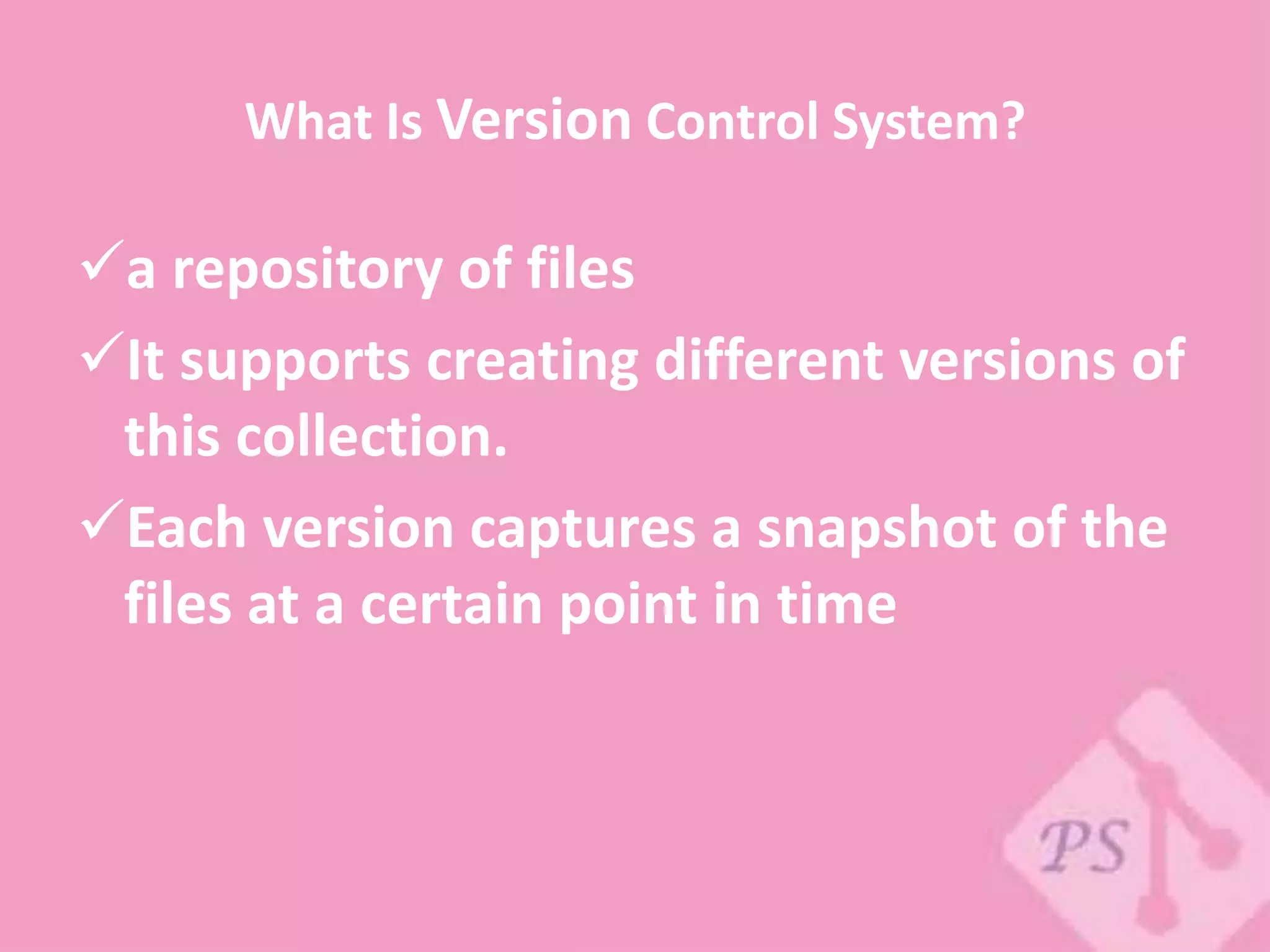 A version control system is a repository that stores different versions of a collection of files over time. It allows teams to create and manage changes to files collaboratively. Version control systems help teams communicate changes, recover accidentally overwritten files, and deploy different versions of code while keeping a record of who made changes and when.
