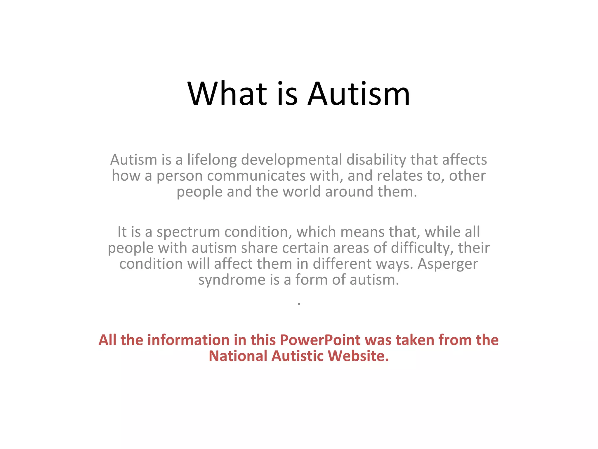 Autism is a lifelong developmental disability that affects how a person communicates with and relates to other people and the world around them. It is a spectrum condition, so it affects people in different ways. Asperger syndrome is a form of autism.