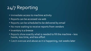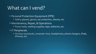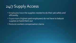 What is Automated Supply Vending? Vending machines can do more than dispense candy and snacks. In fact, they can save your company up to 50% on supply costs and countless man hours due to improved efficiency. If you can imagine it, it can probably be vended in some way. Some common applications for supply vending are PPE (personal protection equipment), MRO (maintenance, repair, and operations), and IT peripherals (chargers, keyboards, computer mice, etc).