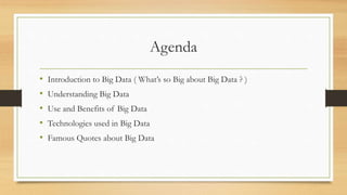 The document provides an overview of big data, highlighting its definition, types (structured and unstructured), and the technologies involved. It emphasizes the significant business value that can be derived from unstructured data, as well as the ways organizations can use big data analytics for customer understanding, market insights, and operational efficiency. Key tools such as Hadoop, R Programming, and Apache Spark are discussed as vital for processing and analyzing big data.