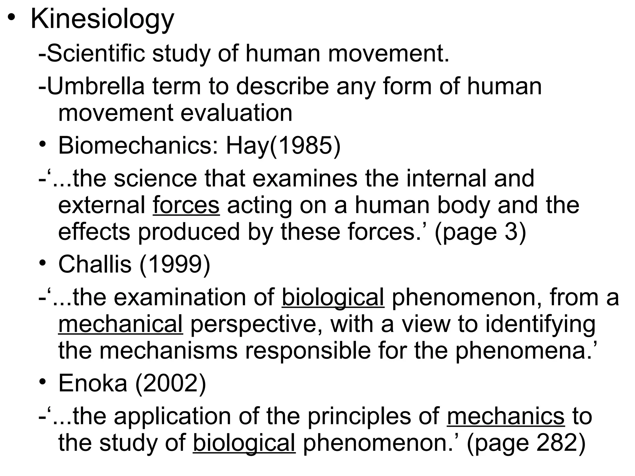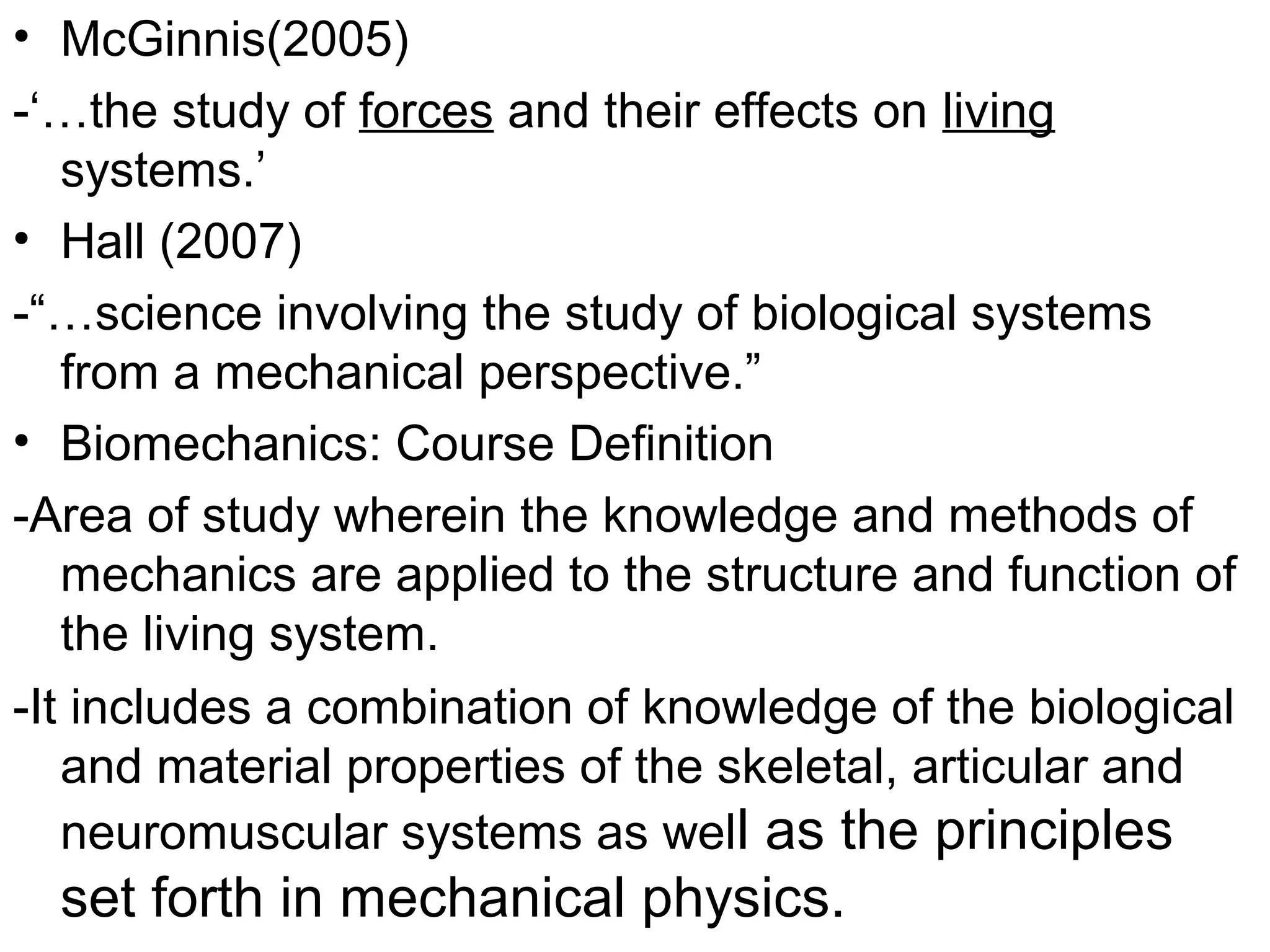 Kinesiology is the scientific study of human movement, while biomechanics examines the internal and external forces acting on the human body and the effects produced by these forces. Biomechanics is defined as the area of study wherein the methods of mechanics are applied to the structure and function of living systems, including knowledge of biological properties and mechanical physics principles. It has branches that study forces in areas like cardiovascular health, orthopedics, rehabilitation, and sports.