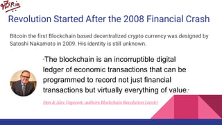 Blockchain is an incorruptible digital ledger that can record transactions of value such as financial or other transactions. It transitions trust from entities to trust in an algorithm through cryptography, blockchains, and consensus algorithms. This allows for decentralized trust and even anonymous transactions. Blockchain has evolved from cryptocurrencies like Bitcoin to include smart contracts on platforms like Ethereum that allow many use cases across private, consortium, and public networks. It could revolutionize how we think about concepts like money, organizations, social networks, and trade.