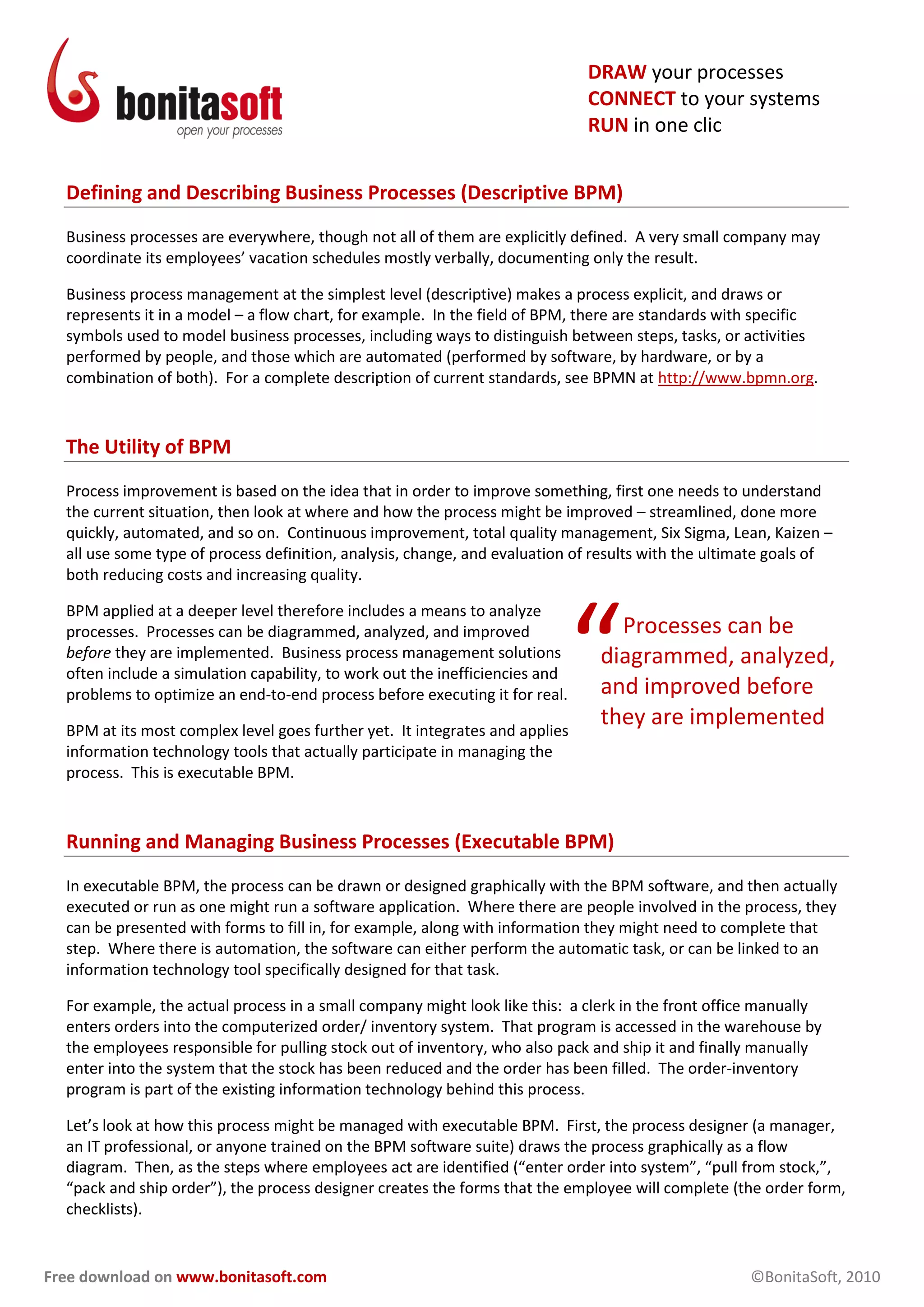 Business process management (BPM) involves graphically modeling processes, simulating them, executing them using both human and automated activities, monitoring them in real-time, and collecting process data. BPM defines and manages "business processes," which are sequences of activities important to an organization. It makes processes explicit through modeling and aims to improve efficiency and quality by analyzing and optimizing processes before implementation.