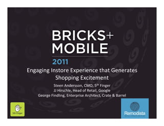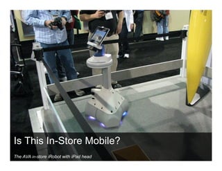 This document discusses in-store mobile and its role in generating shopping excitement. It notes that 70% of smartphone owners use their mobile devices while shopping in-store for tasks like price comparisons, customer reviews, stock checks, and accessing coupons and promotions. Retailers are leveraging mobile to provide richer in-store experiences through features like in-store ordering and check-out on iPads. In-store mobile engagement tools from companies like Shopkick use achievements and deals to motivate customers during shopping. The document concludes that mobile will continue to enhance the in-store experience through functions like serving as customers' digital wallet and shopping assistant.
