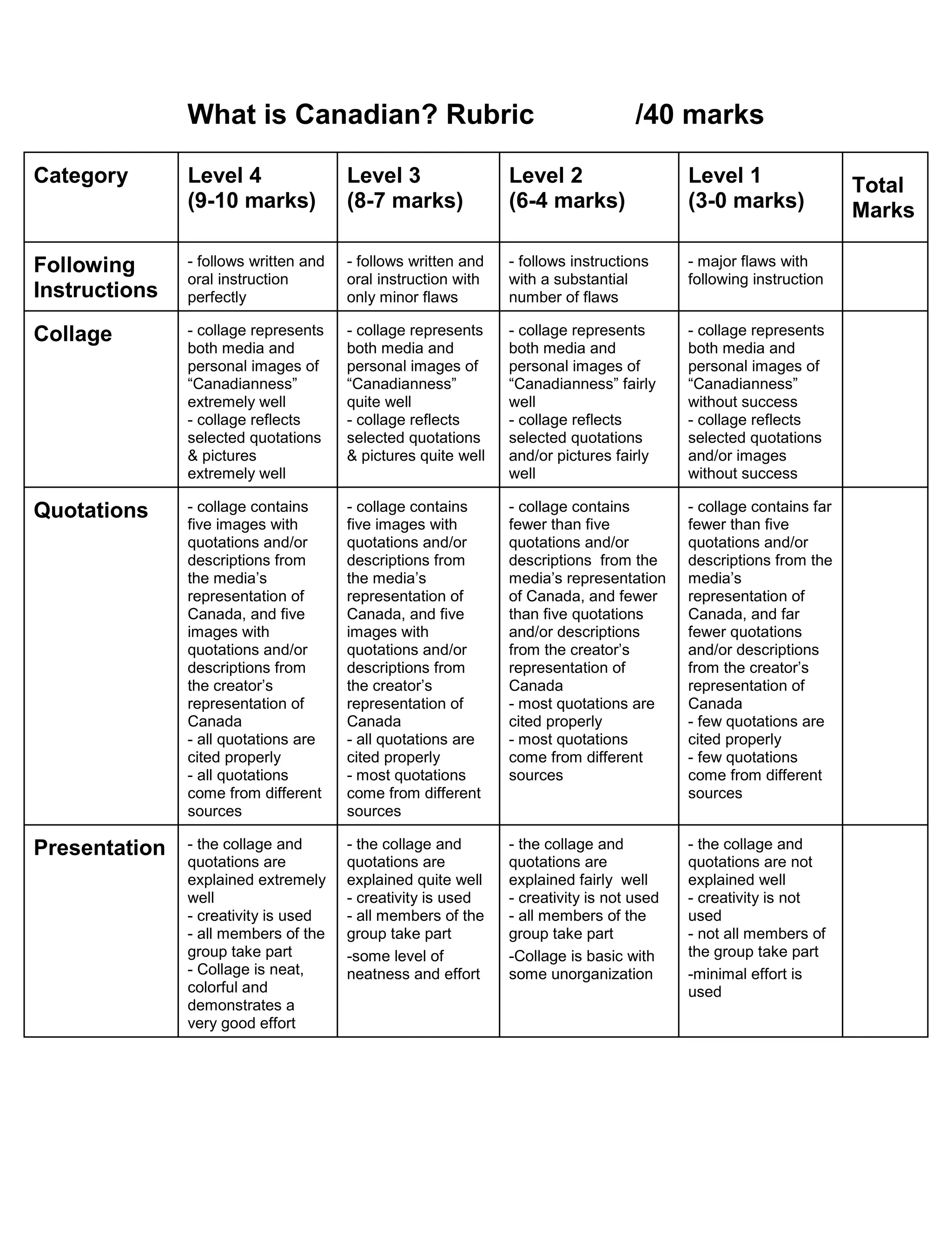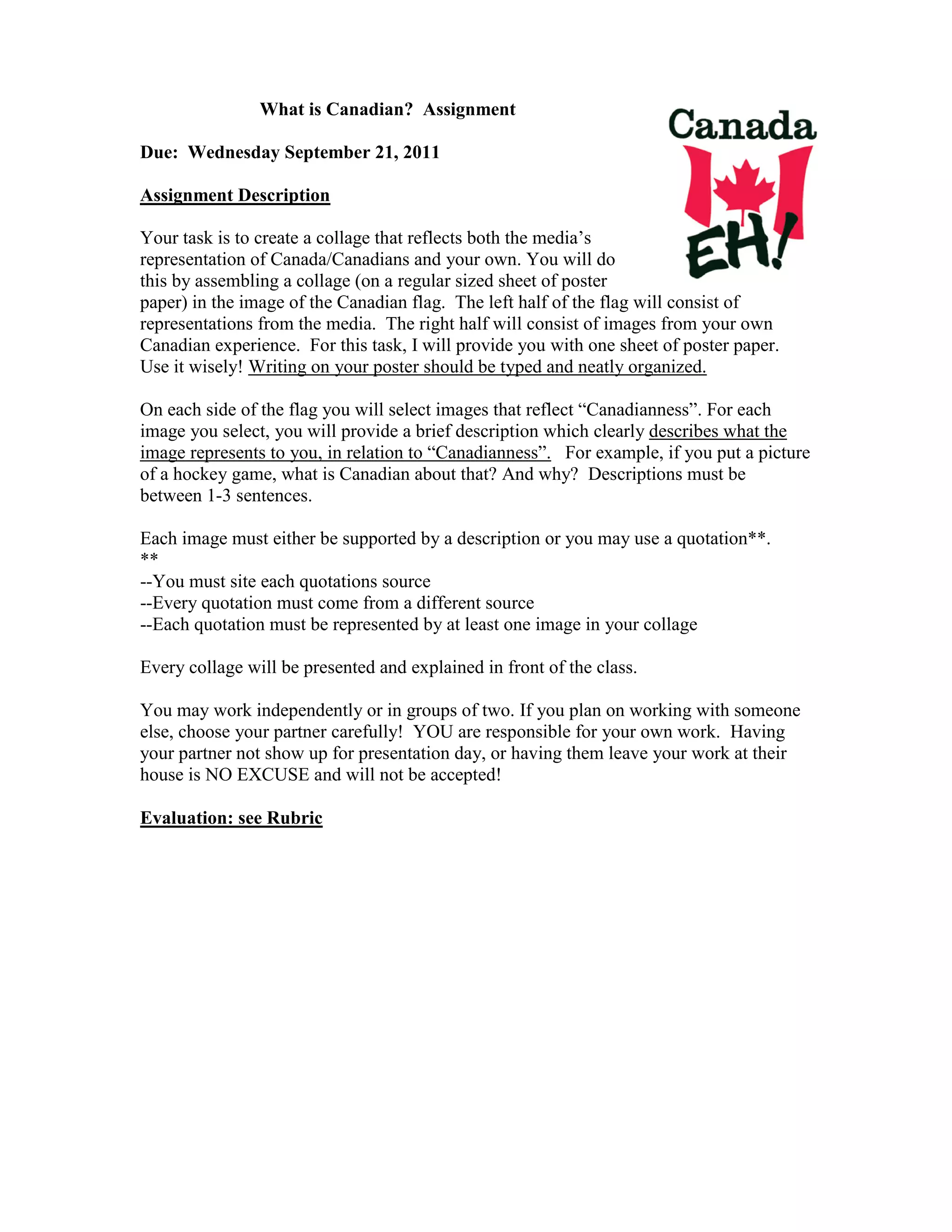 This document outlines an assignment asking students to create a collage representing Canadian identity. The collage must be assembled on a poster board in the shape of the Canadian flag, with the left side depicting media representations and the right side depicting personal experiences. Students must include images and brief descriptions or quotations for each, citing sources. Groups of two can work together but each student is responsible for their own portion. The collage and explanations will be presented to the class and graded on a rubric evaluating following instructions, representation of themes, use of quotations, and presentation.