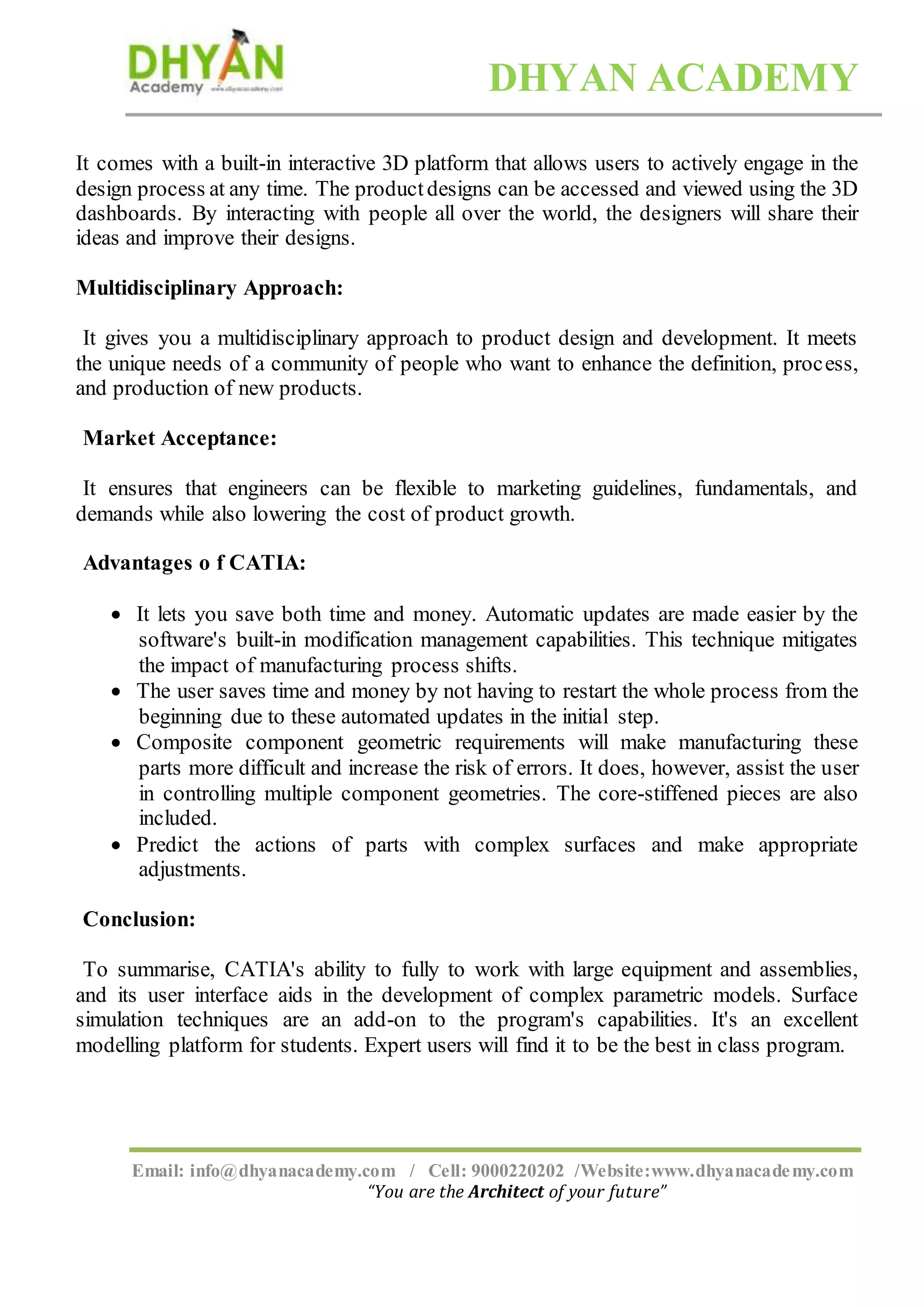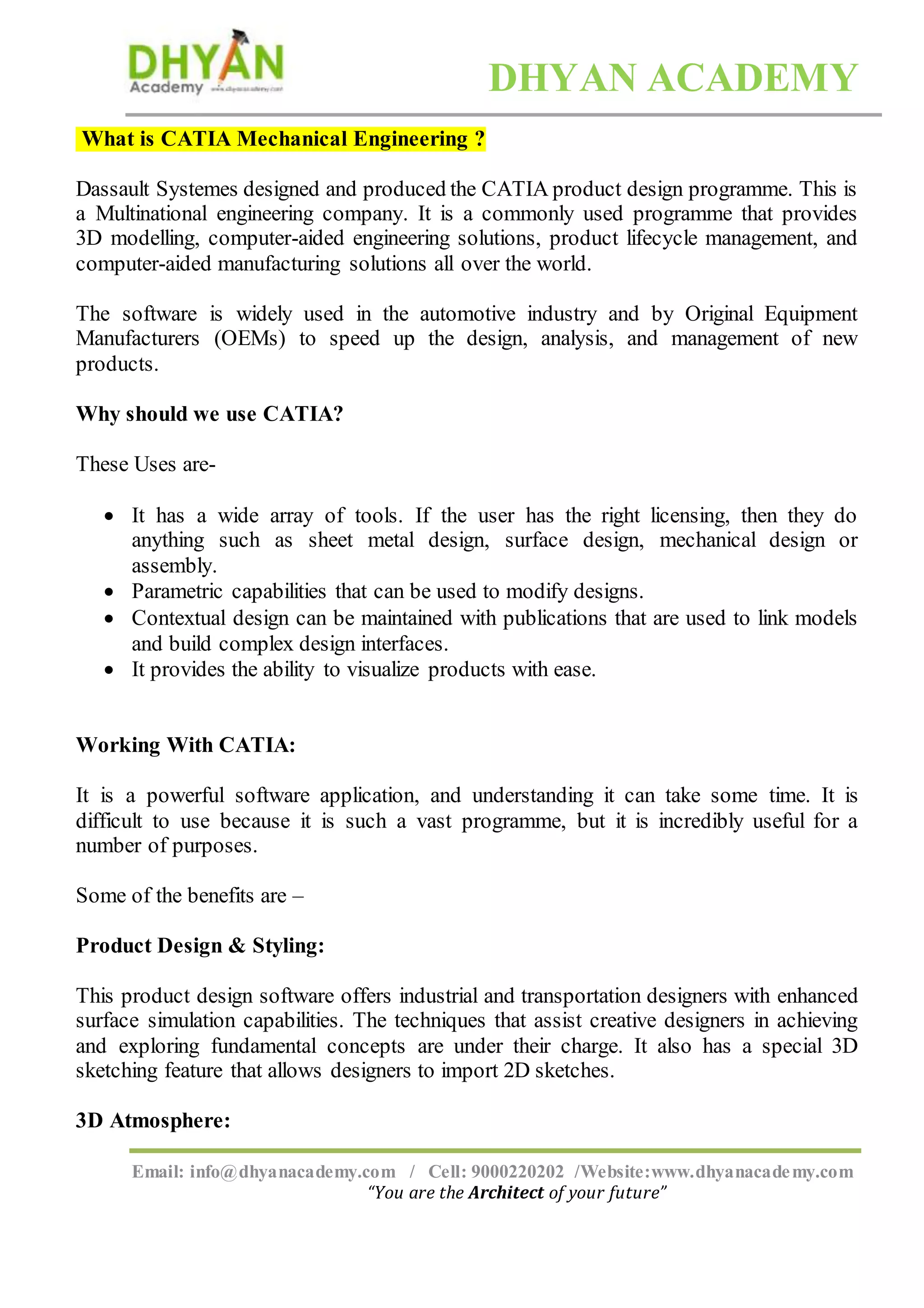 CATIA is a 3D modeling software used by engineers and designers for product design. It allows users to design in 3D, perform engineering analysis, manage product data over the life of a product, and optimize manufacturing processes. Some key benefits of CATIA include its wide array of tools for mechanical design, surface design, and assembly. It also offers parametric modeling capabilities and contextual design features. CATIA provides an interactive 3D environment for visualizing designs and sharing ideas with others. It takes an integrated, multidisciplinary approach to product design and development.