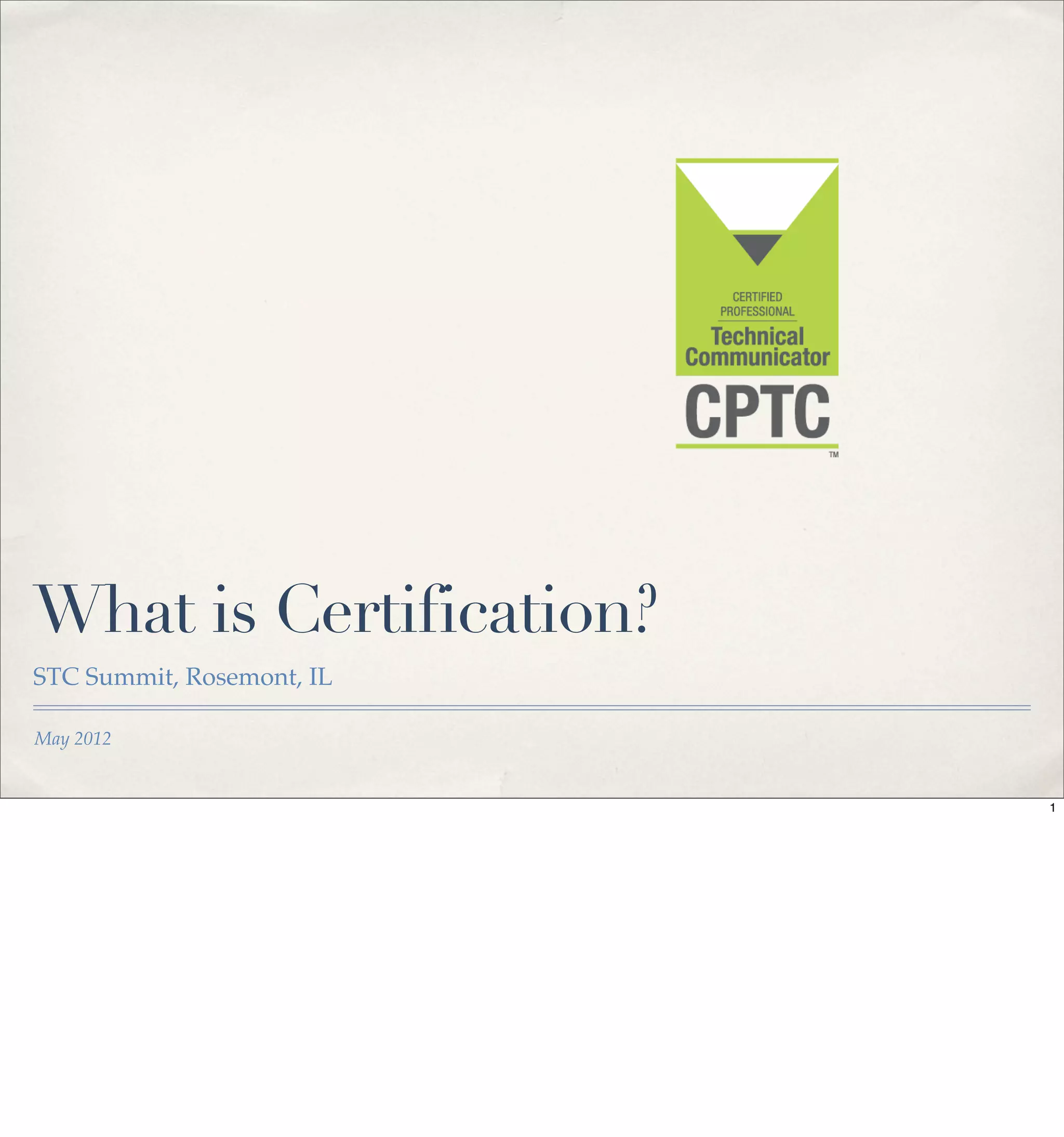 The document outlines the process and value of obtaining the CPTC™ certification for technical communicators, detailing eligibility requirements, application procedures, and the benefits of certification for both individuals and employers. It emphasizes the importance of certification in enhancing career opportunities, salary potential, and establishing the profession's credibility. Additionally, it highlights the ongoing requirements for maintaining certification and the transformational nature of the credential for practitioners and the profession as a whole.