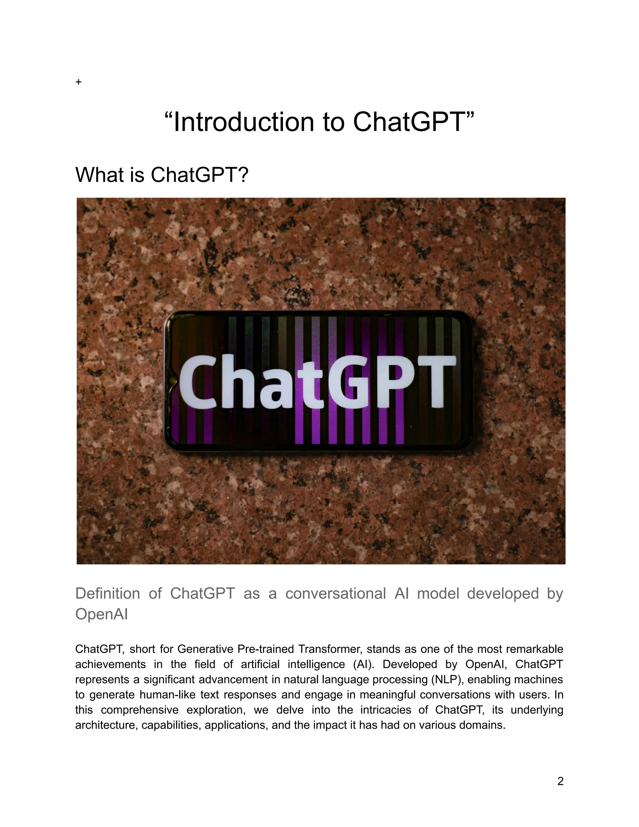 ChatGPT, developed by OpenAI, is a groundbreaking conversational AI model based on the transformer architecture, enabling machines to generate human-like text responses and engage in meaningful conversations. It builds upon previous iterations like GPT-1, GPT-2, and GPT-3, showcasing advanced capabilities in natural language understanding and generation across various applications including customer service and content creation. Despite its potential, ChatGPT raises ethical concerns regarding misinformation and bias, highlighting the need for responsible deployment of AI technologies.