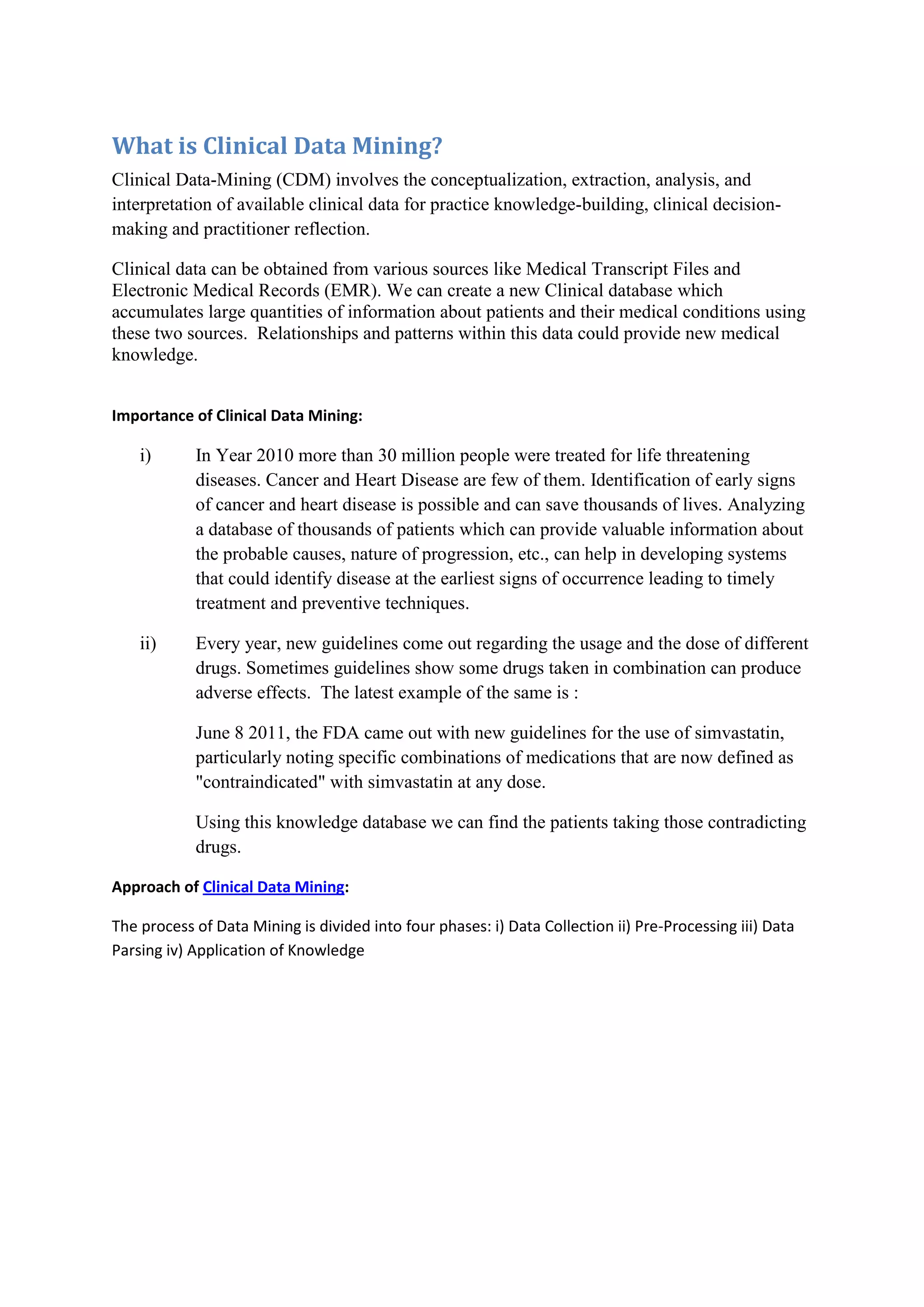 Clinical data mining (CDM) is the process of analyzing and interpreting clinical data to improve healthcare practices and decision-making. It involves collecting data from sources like medical transcripts and electronic medical records, and can help identify patterns that lead to early disease detection and improved treatment guidelines. The process of CDM includes phases of data collection, pre-processing, data parsing, and the application of knowledge to enhance patient care and medical research.