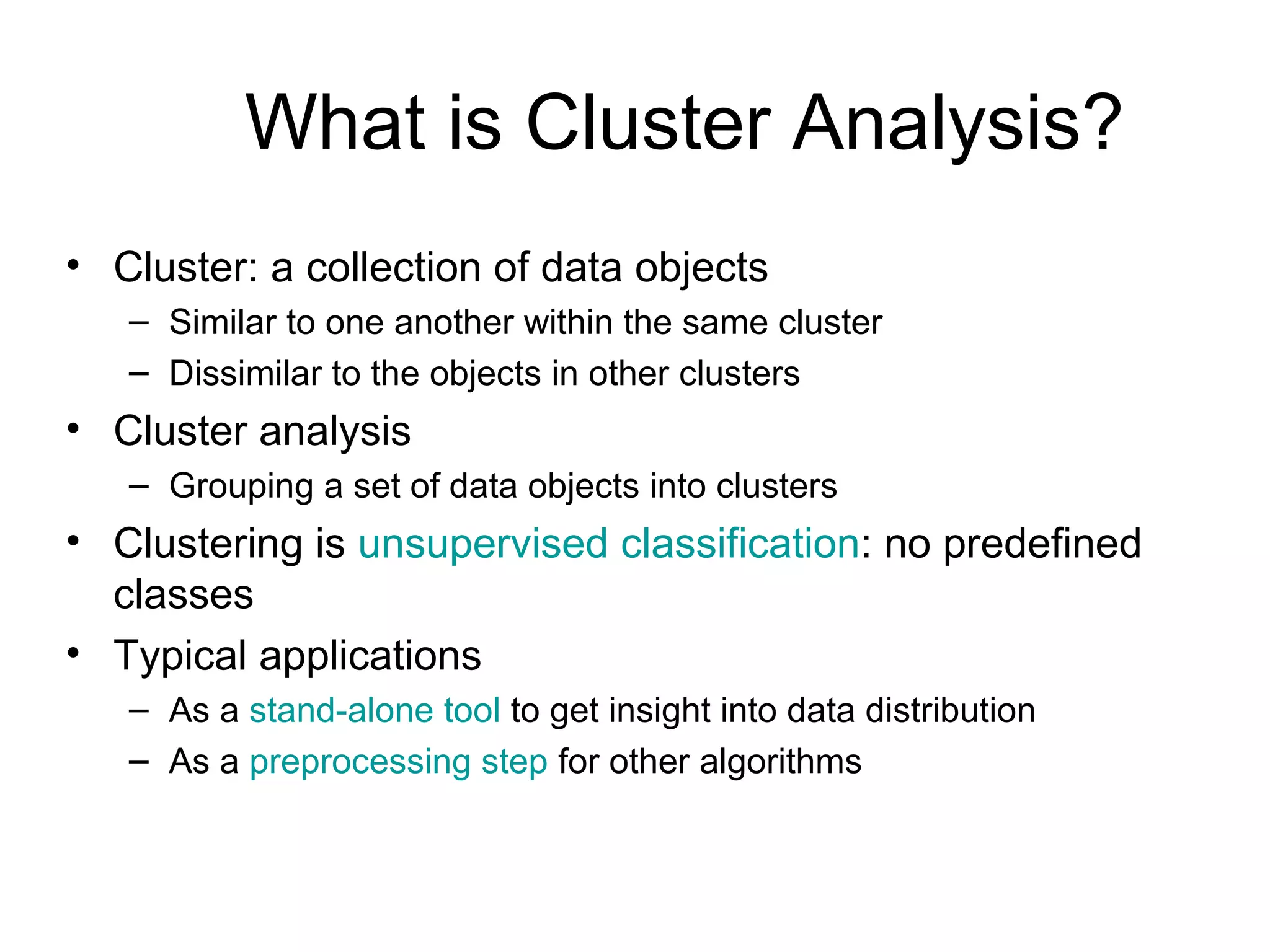 Cluster analysis is an unsupervised machine learning technique that groups unlabeled data points into clusters. The goal is to categorize data objects such that objects within a cluster are as similar as possible to each other, and as dissimilar as possible to objects in other clusters. Good clustering produces high quality clusters with high intra-class similarity and low inter-class similarity. Clustering has applications in marketing, land use analysis, insurance, and other domains.