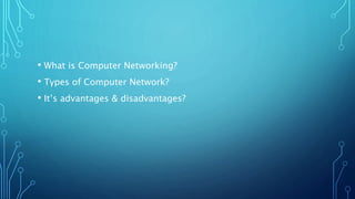 A computer network is a group of interconnected computers that share resources. The types of networks come with advantages such as ease of access, file sharing, security, and backup, while disadvantages include the need for network devices, vulnerability to virus attacks, and associated costs.