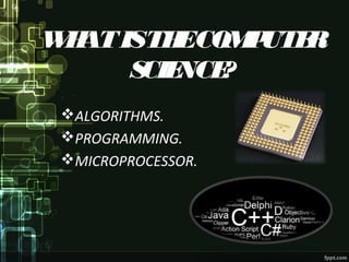The document discusses computer science and its applications. It defines computer science as the study of computer hardware, software, and application of technology. It lists algorithms, programming, and microprocessors as key aspects of computer science and discusses how computer science is experienced in daily life through computerized systems and technologies. It also mentions robotics and space shuttles as new frontiers for computer science.