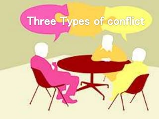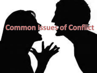 Conflict can occur for many reasons, including differences in opinions, personality clashes, and unresolved issues from the past. There are several types of conflict, such as subject-oriented conflicts over substantive topics, communication breakdowns, and ego conflicts due to personality differences. When resolving conflicts, it is important to stick to the current issues, compromise when possible, and avoid personal attacks or trying to "win" at all costs. Timing discussions sensitively and focusing on the specific issues can help reduce conflicts between partners.