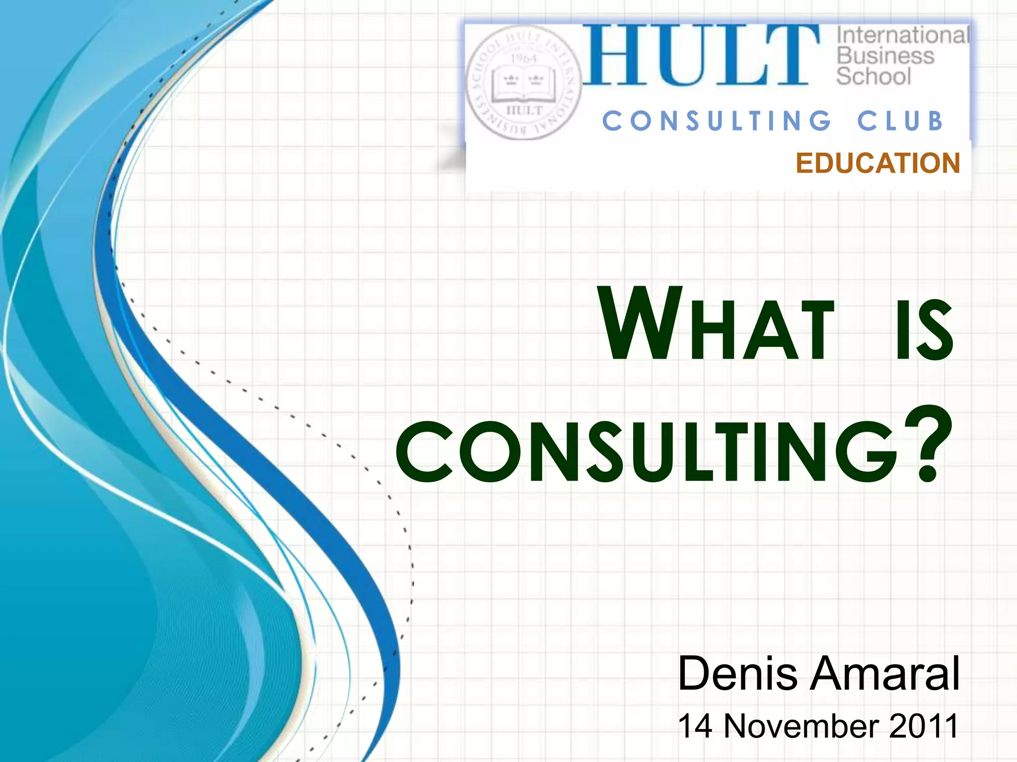 This document provides an overview of consulting as a profession. It begins with defining consulting as the business of giving expert advice to other professionals, typically in business matters. It then discusses what qualities and skills are required to become a consultant, such as time management, commitment to results, and communication skills. Finally, it shares some of the author's personal experiences working as a management consultant for various companies.