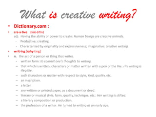 ![What is creative writing?Dictionary.com :cre·a·tive (krē-ā'tĭv) adj. Having the ability or power to create: Human beings are creative animals. - Productive; creating. - Characterized by originality and expressiveness; imaginative: creative writing.writ⋅ing[rahy-ting] n. the act of a person or thing that writes.- written form: to commit one's thoughts to writing.that which is written; characters or matter written with a pen or the like: His writing is illegible.such characters or matter with respect to style, kind, quality, etc.an inscription.a letter.any written or printed paper, as a document or deed.literary or musical style, form, quality, technique, etc.: Her writing is stilted.a literary composition or production.the profession of a writer: He turned to writing at an early age.](https://image.slidesharecdn.com/cww-whatiscreativewriting-100617122738-phpapp01/85/What-is-Creative-Writing-2-320.jpg)