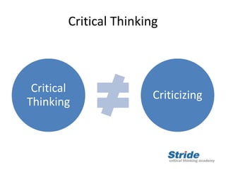 Critical thinking is the process of actively and skillfully conceptualizing, applying, analyzing, synthesizing, and evaluating information. It involves making reasoned judgments through a framework that includes identifying problems, gathering and assessing relevant evidence, recognizing assumptions, and considering alternative solutions and their implications. Logical reasoning is a core part of critical thinking and can take the form of deductive or inductive arguments. Training in critical thinking helps develop skills in logical decision making, persuasive writing and interviews, and intelligent discussion.