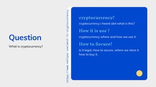 The document provides an educational overview of cryptocurrency, explaining it as a digital currency that enables peer-to-peer transactions with low fees and no government association. It highlights how cryptocurrencies work using blockchain technology and their increasing popularity due to the potential for profit and ease of use. Additionally, it discusses the benefits of cryptocurrency, including decentralized control and enhanced security.