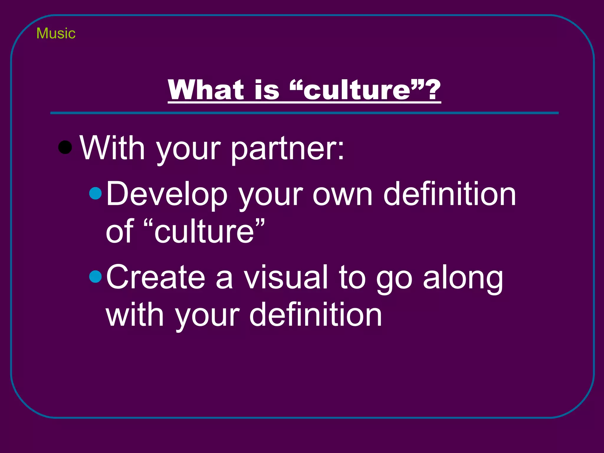 The document defines culture as a people's total way of life that is learned and passed down between generations, influencing personality and behavior. It discusses various aspects of culture including social organization (family structures, social classes), customs and traditions, language, arts/literature, religion, governments, and economics. Culture is difficult to understand due to racism, ethnocentrism, and judging other cultures by one's own standards. Culture changes over time due to factors like technology, environment, new ideas, and cultural diffusion.