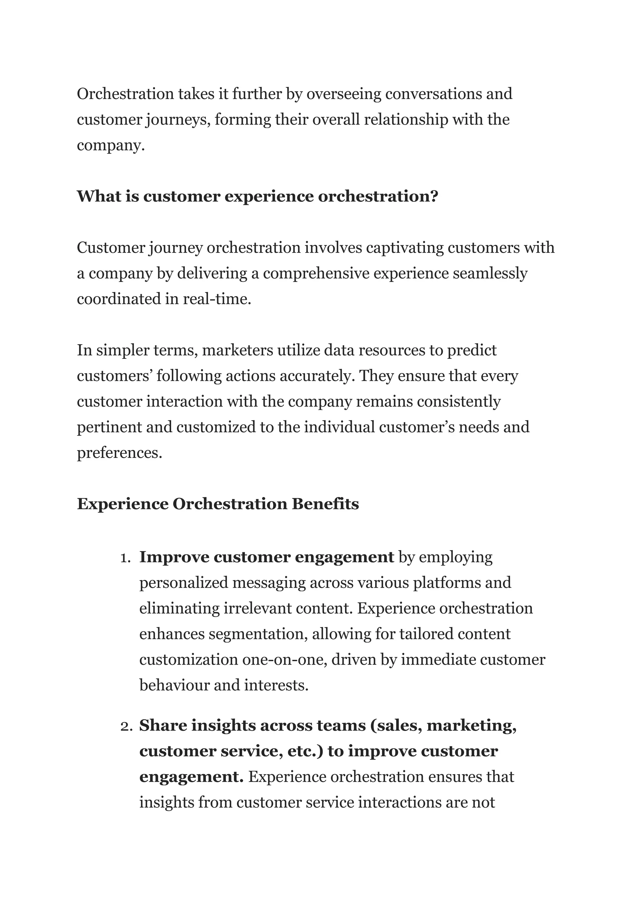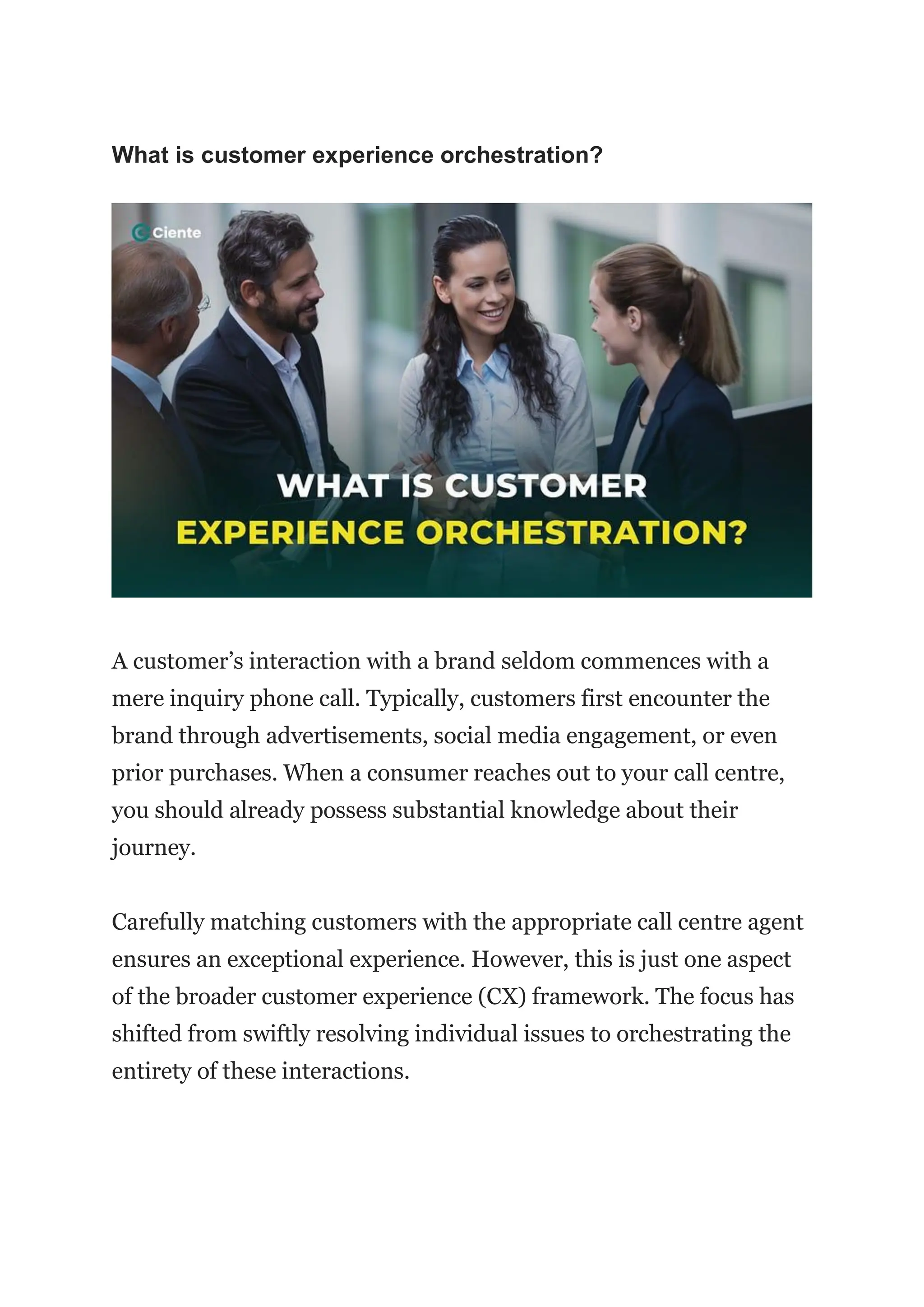 Customer experience orchestration involves managing and enhancing the overall relationship a customer has with a brand through personalized and contextually relevant interactions across multiple channels. It utilizes data to predict customer behavior, improve engagement, and boost sales by tailoring communications while sharing insights across departments. The goal is to integrate empathy and human connection into each customer interaction, ensuring that they feel acknowledged and understood.