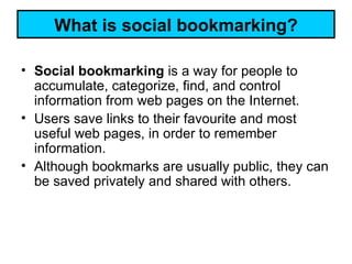 Delicious is a social bookmarking website that allows users to save and organize website links from any computer. It provides benefits over traditional bookmarks by making links accessible from any device and allowing users to share bookmarks with others. Users can tag bookmarks with keywords to help organize and search links by topic. The site also offers access to bookmarks made by other users with similar interests to expand one's own collection of curated links.