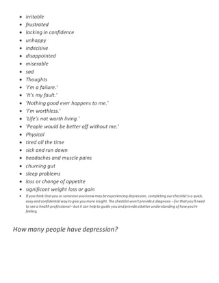 - Signs of depression include changes in sleep, appetite, energy level, concentration, and feelings of worthlessness. It can be treated through lifestyle changes, therapy, medication, or a combination.