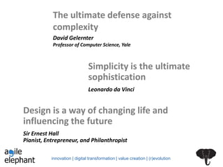 The document discusses the concept and significance of design thinking in innovation and digital transformation, emphasizing that design is not just about aesthetics but about how things work. It outlines the history and key principles of design thinking, the importance of empathy in the design process, and various methods and tools for ideation and prototyping. Companies that prioritize design as a core component of their business strategy reportedly outperform their peers significantly, indicating the value of design-led innovation.