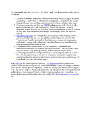 DevOps is a set of practices that integrates software development and IT operations to enhance the software delivery process by fostering collaboration, automation, and continuous improvement. It utilizes tools like CI/CD and infrastructure-as-code to streamline development and deployment, resulting in faster time-to-market and improved software quality. Companies like Cloudzenix offer services to help organizations implement DevOps practices for more efficient software delivery.