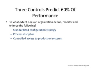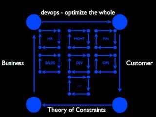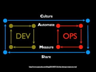 The document discusses the origins and key principles of DevOps. It originates from a 2009 Velocity Conference talk about Flickr's deployment practices of 10+ deploys per day through automation, shared version control, and one-step builds. The main principles discussed are CAMS - Culture, Automation, Measurement, and Sharing. Culture focuses on respect, trust, and avoiding blame. Automation, measurement, and sharing are also emphasized as important aspects of DevOps.