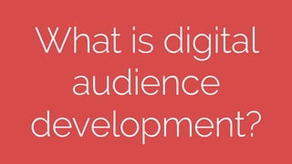 Digital audience development focuses on activities that meet the needs of existing and potential audiences, helping arts organizations build ongoing relationships. It encompasses marketing, programming, education, and the use of digital technology to enhance participation and learning. Challenges include artistic imperatives, organizational silos, and the need for effective audience engagement strategies.