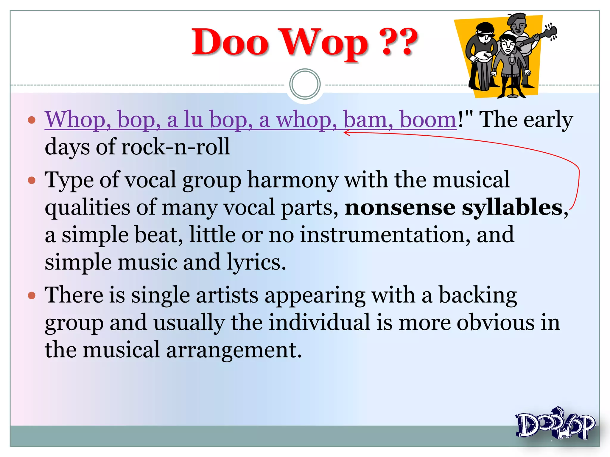 Doo wop is a style of vocal-based rhythm and blues music that developed in the 1940s-1960s. It features vocal harmony with nonsense syllables, a simple beat, and little instrumentation. Typical instruments included the double bass, electric guitar, saxophone, drums, and piano. Doo wop emerged from African American communities in cities like New York, Philadelphia, and Los Angeles. Popular doo wop artists included The Clovers, The Coasters, The Drifters, and The Flamingos. Billy Joel's song "For The Longest Time" is discussed, along with positive reviews of how it calms babies and was used in a marriage proposal.