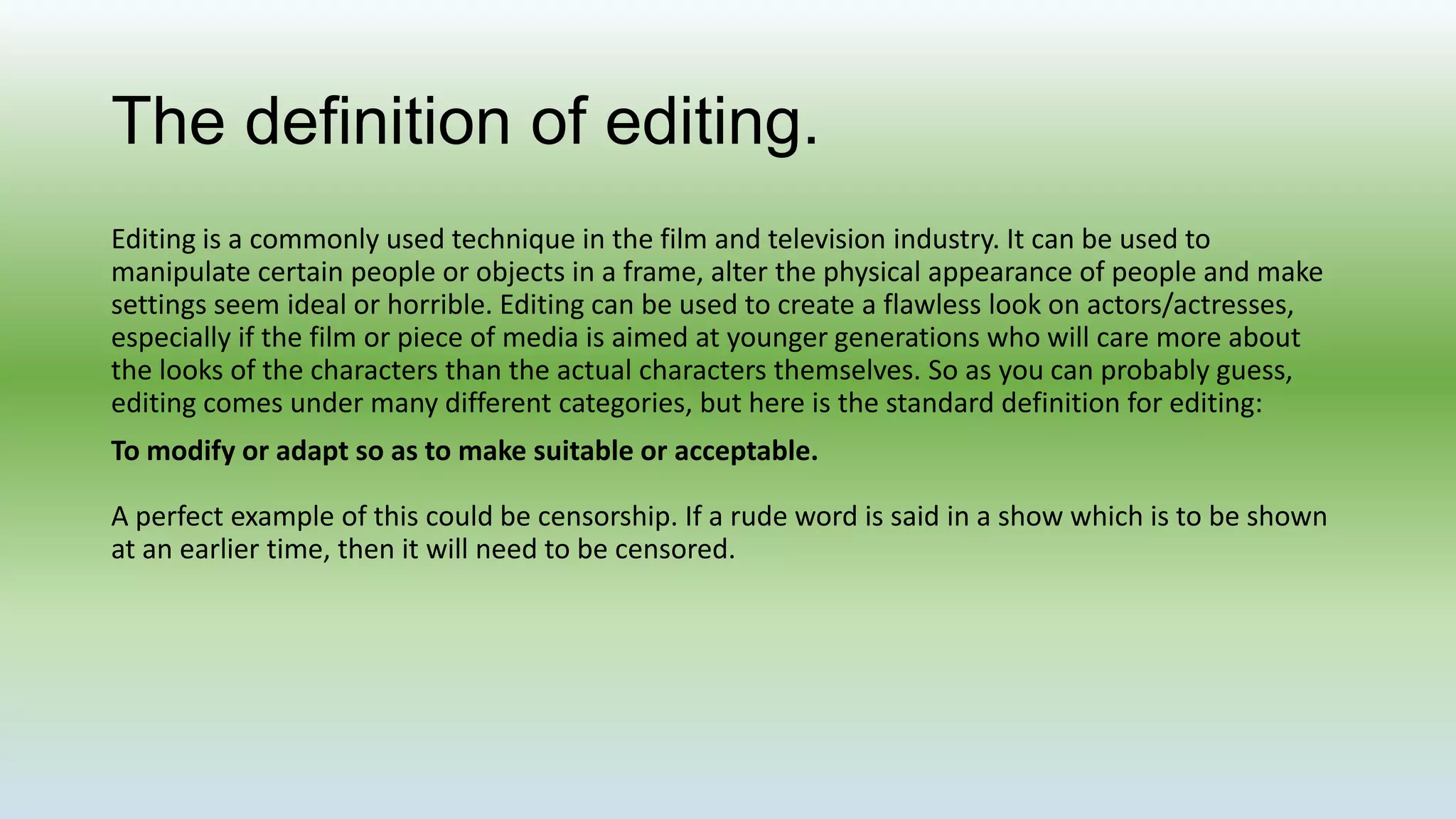 Editing is a technique used in film and television to manipulate people or objects on screen, alter appearances, and make settings seem ideal. There are many categories of editing, including censorship to make content socially acceptable. Censorship can involve bleeping out swear words, blurring offensive images, or cutting inappropriate content. The order and timing of scene changes through techniques like fades and blackouts can convey emotion and importance. Final editing ensures continuity of motion between shots and proper sequencing before a film's release.