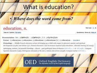 Education is generally defined as the process of learning and acquiring information. It can take place both through formal schooling and informal life experiences. Martin Luther King Jr. believed that true education should enable one to discern truth from falsehood and develop both intelligence and strong moral character. The document explores different definitions and perspectives on the meaning of education through various online sources.