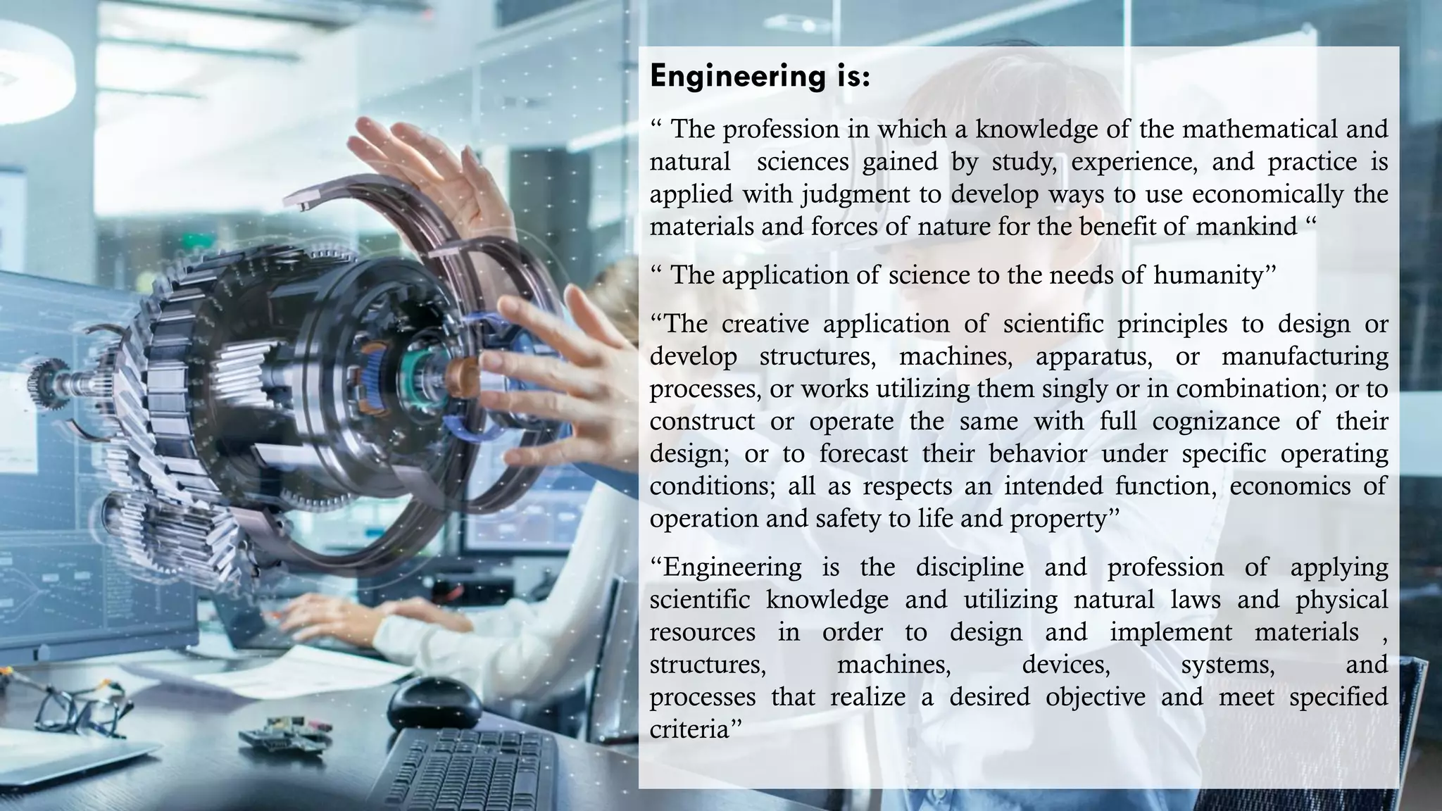 Engineering is defined as the application of scientific knowledge and natural laws to design, develop, and implement materials and systems that fulfill human needs while ensuring safety and efficiency. Mechanical engineering, a key discipline within engineering, focuses on the generation and application of heat and mechanical power, emphasizing the design and analysis of a wide array of systems and products spanning various industries. Mechanical engineers play a crucial role in addressing contemporary challenges and innovating solutions across sectors like healthcare, transportation, and climate change.