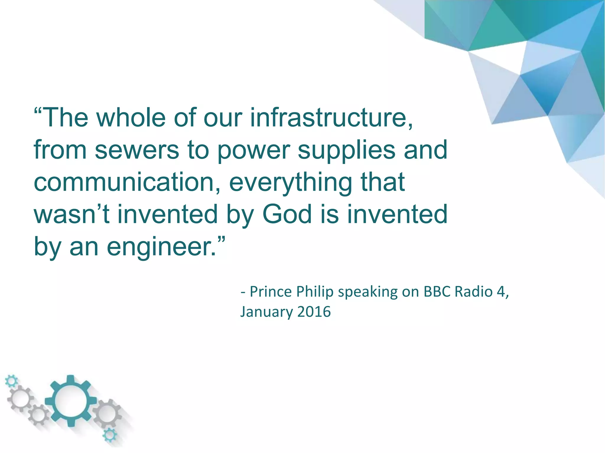 The document promotes engineering as a career by highlighting its importance, opportunities, and benefits. It notes that engineers design solutions to meet people's needs and make lives better through innovations. There is a high demand for engineering graduates and skills. The career offers good salaries, interesting challenges, and work-life balance. Various paths like apprenticeships and university degrees can lead to engineering roles and professional qualifications.
