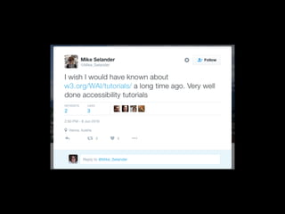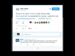 The Education and Outreach Working Group (EOWG) develops support materials to help people understand and implement web accessibility standards. It works to make other WAI groups' deliverables more understandable through liaisons. EOWG engages communities to advance accessibility, identifies and addresses education needs, and maintains over 80 resources on topics like meeting WCAG 2.0, evaluation tools, and tutorials. The group is involved in outreach, resource management, and redesigning W3C's accessibility site for improved findability.