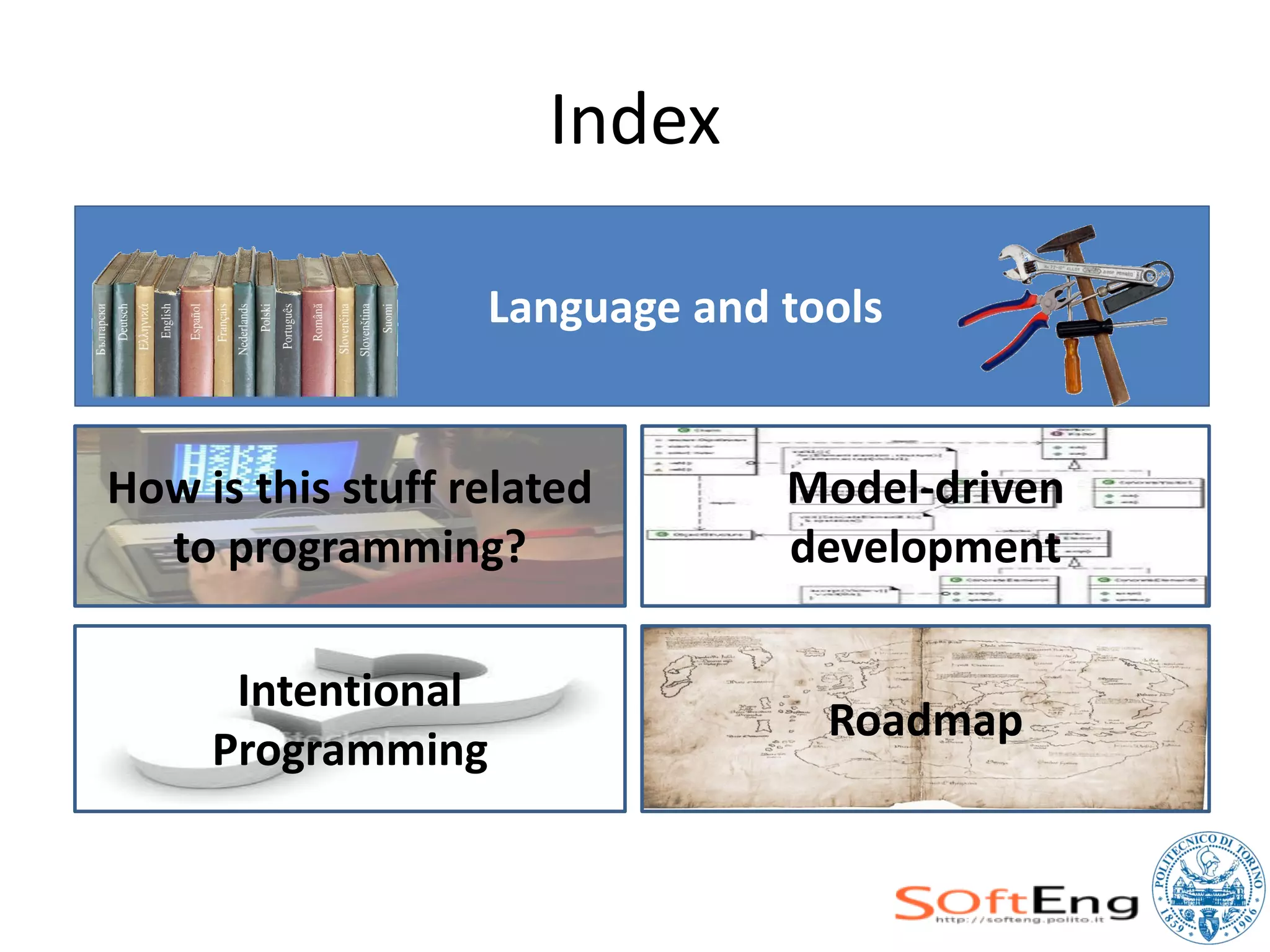 This document discusses linguistic relativity and how the tools we use shape our thinking. It summarizes the key points of several documents and papers on this topic. It then discusses model-driven development and intentional programming approaches. The rest of the document outlines roadmaps for building prototype programming languages and editors based on these concepts.