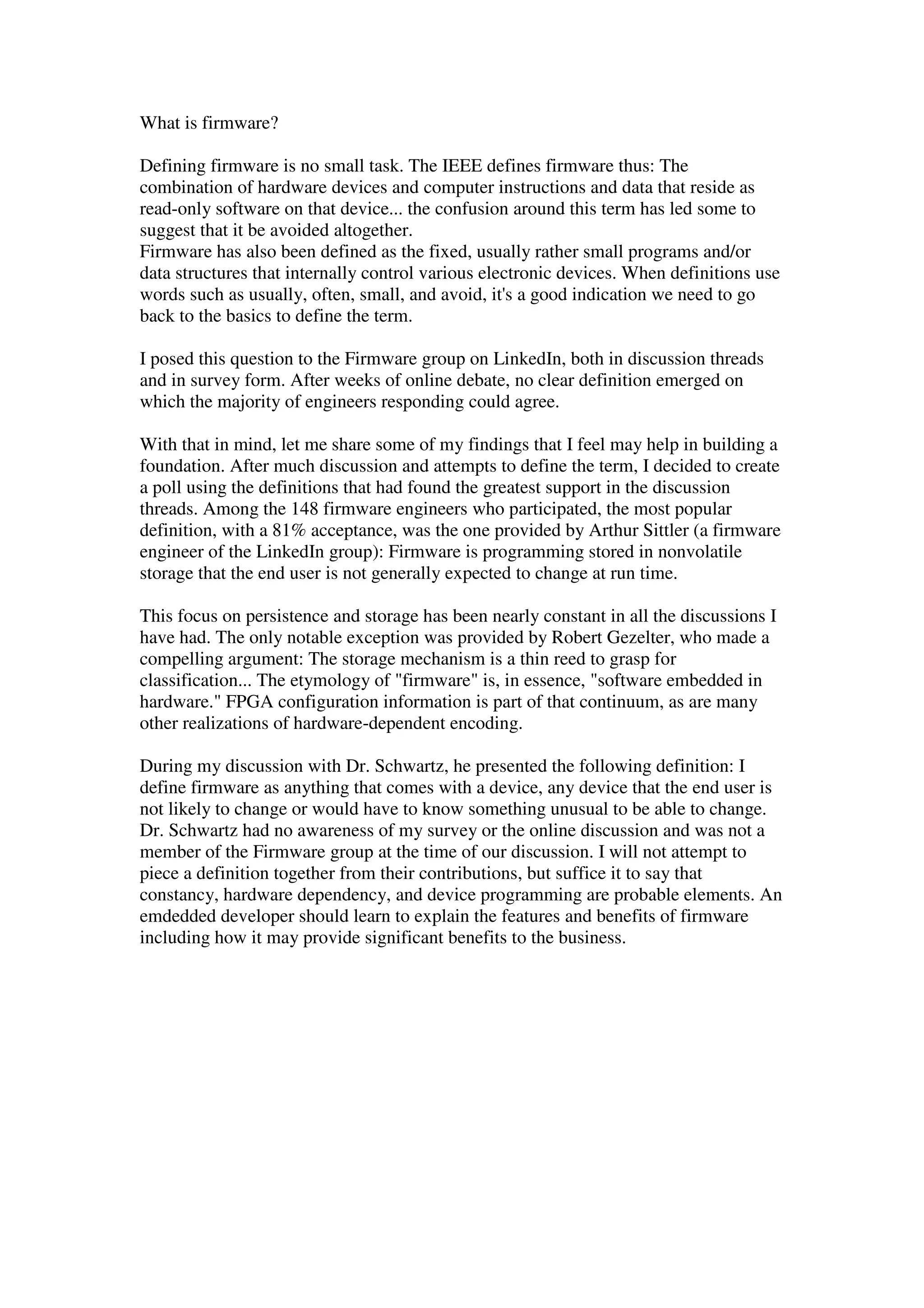 Defining firmware has proven challenging, with the IEEE describing it as a combination of hardware devices and software instructions residing in read-only memory. A survey of 148 firmware engineers revealed that 81% agreed with a definition emphasizing firmware as programming stored in nonvolatile storage, which the user is not expected to change at runtime. Key elements of firmware definitions include persistence, hardware dependency, and the programming of devices, suggesting a foundation for understanding its role in embedded systems.